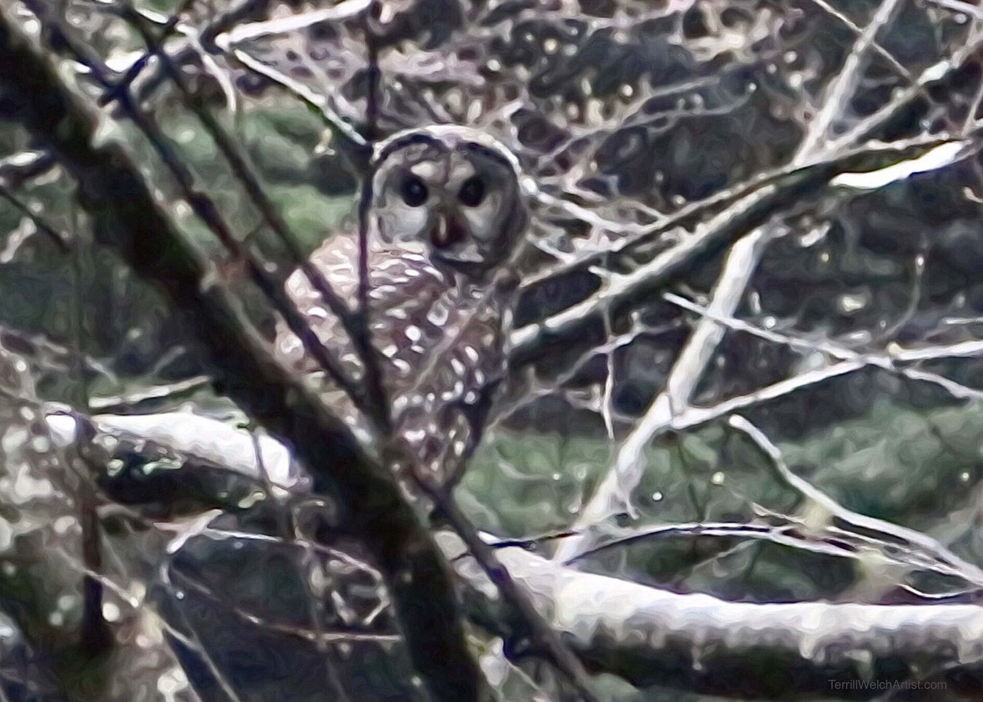 I woke one morning two weeks ago today to geese landing onto the field in the valley below. We have a window slightly open to listen to the frogs at night. So the geese were loud! I lifted my head off the pillow and looked out the window into the side yard and there was an owl fluttering onto a low branch of the fir tree about 15 feet away. Then I was really awake! 😂 I got a rather blurry photograph with the big camera of it a little later when the owl was up in the alder tree. But the image is just “evidence” not a great photograph. Still, I thought you might like to see.