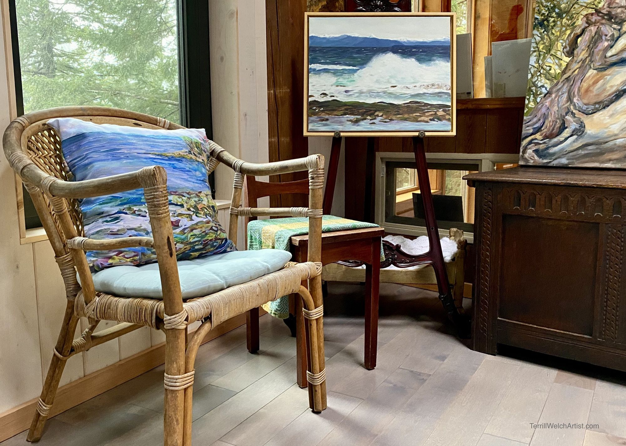 We have everything for both of the new gallery rooms, including paintings, furniture and products tucked into our home right now. I had put the antique show easel in the bedroom and it had nothing on it for days. Then I thought what am I doing!? It could be hosting a painting while it sits there taking up space! This seascape is by Jody Waldie and David and I added it to our art collection a couple of years ago. You are probably wondering what we are doing collecting art when we already have a house full of my own paintings. The truth is we enjoy the variety of special works by some of our favourite artists. And as a painter, it is more restful to look at something that I haven’t laboured over.