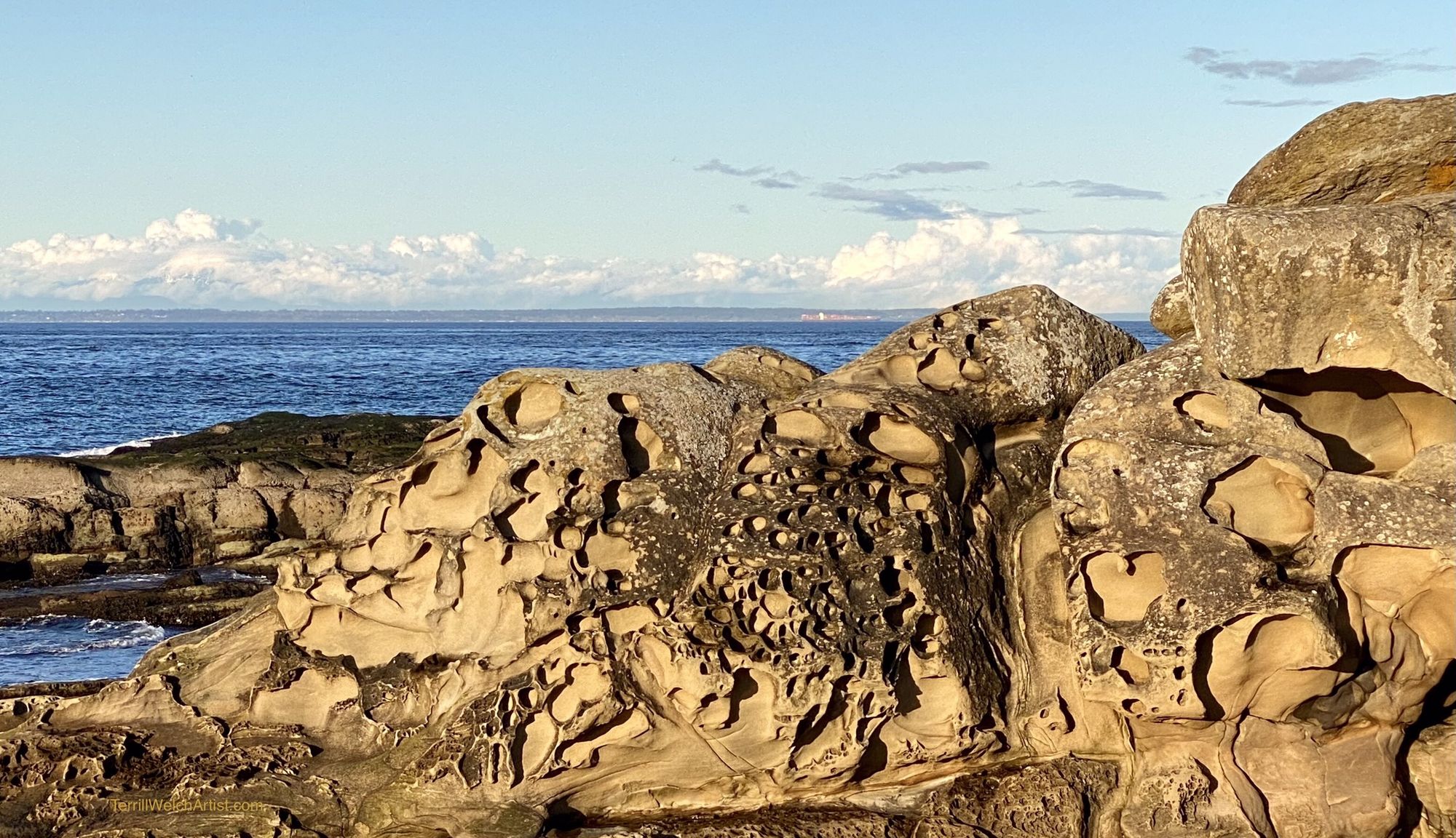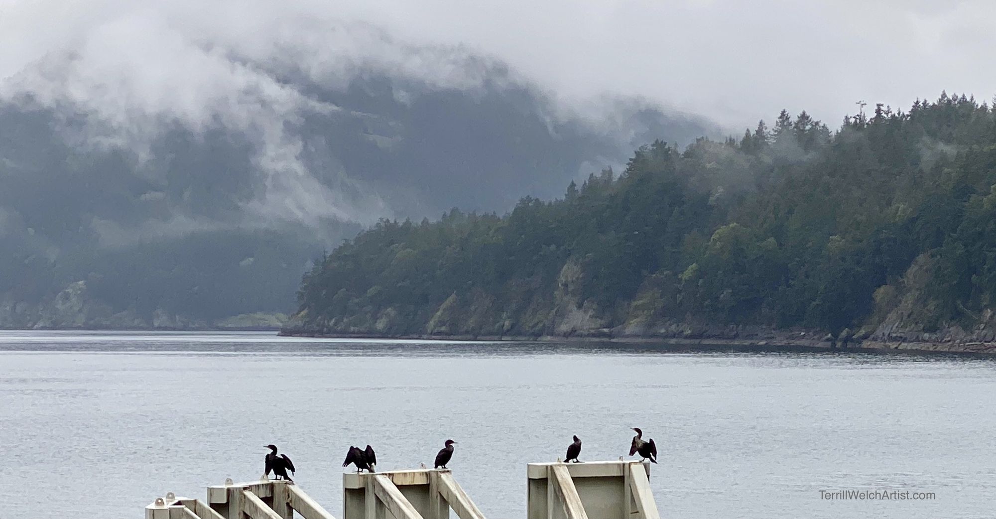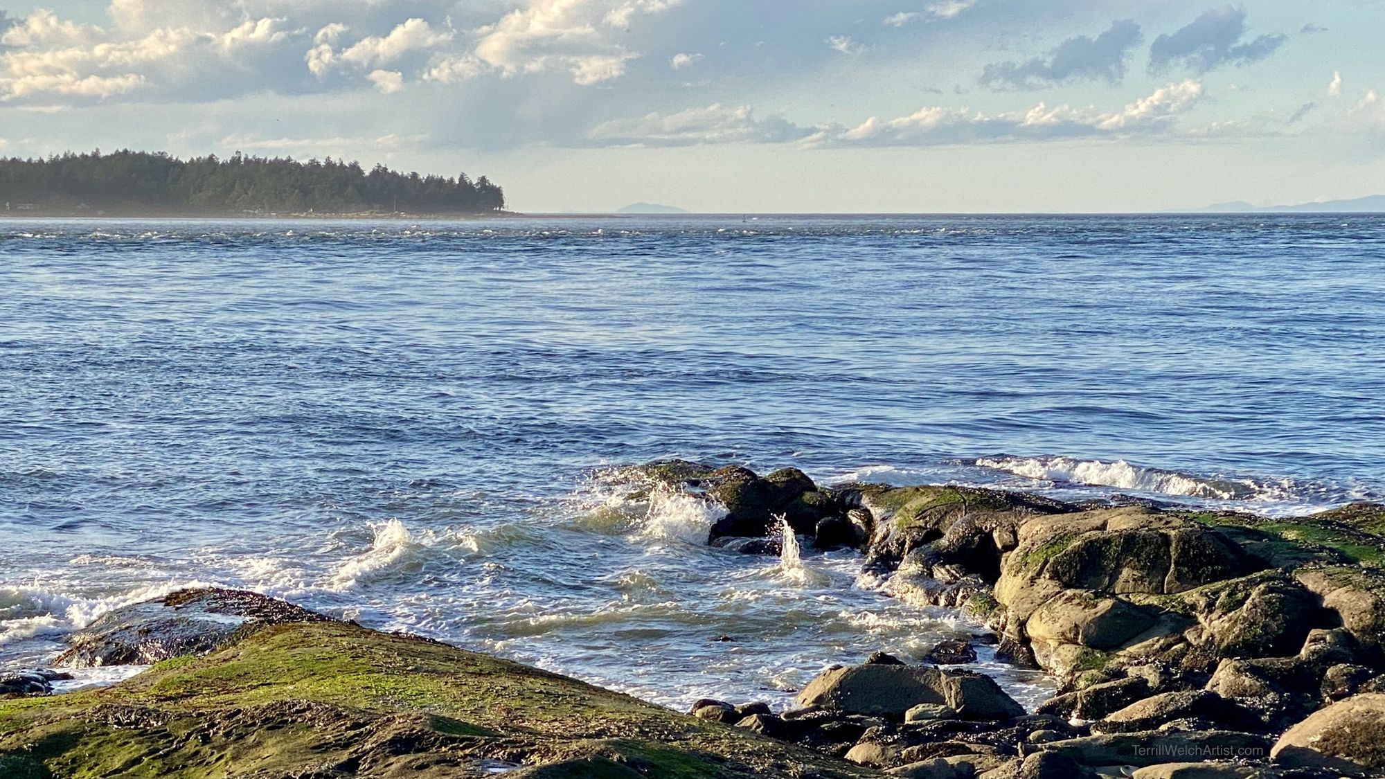 Jody’s Artist Notes: The seagulls and I tuck in for a symphony of wind and waves. The lights and darks of a spring storm trick us into thinking we can almost touch the mountains across Georgia Strait.