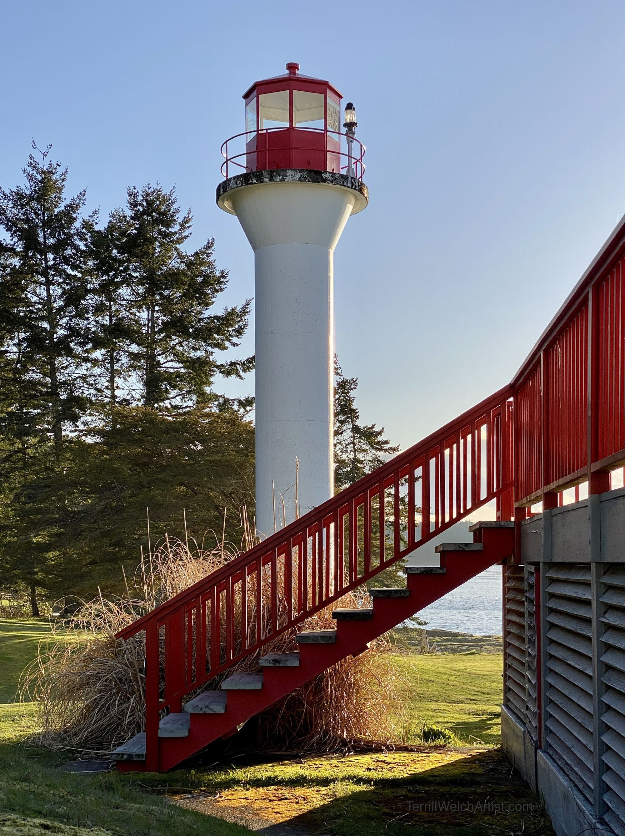 The late sun casts sharp angles of light beside the stairs at the lighthouse.