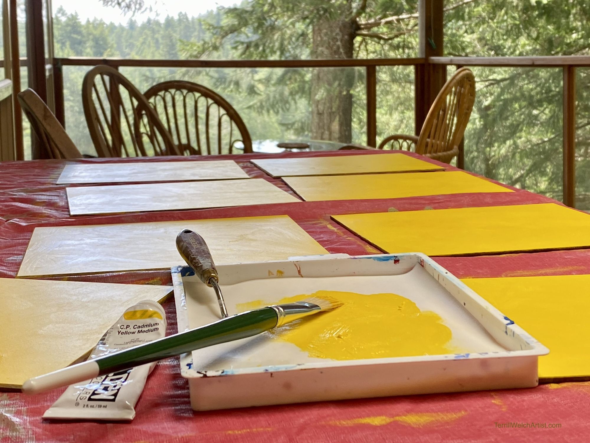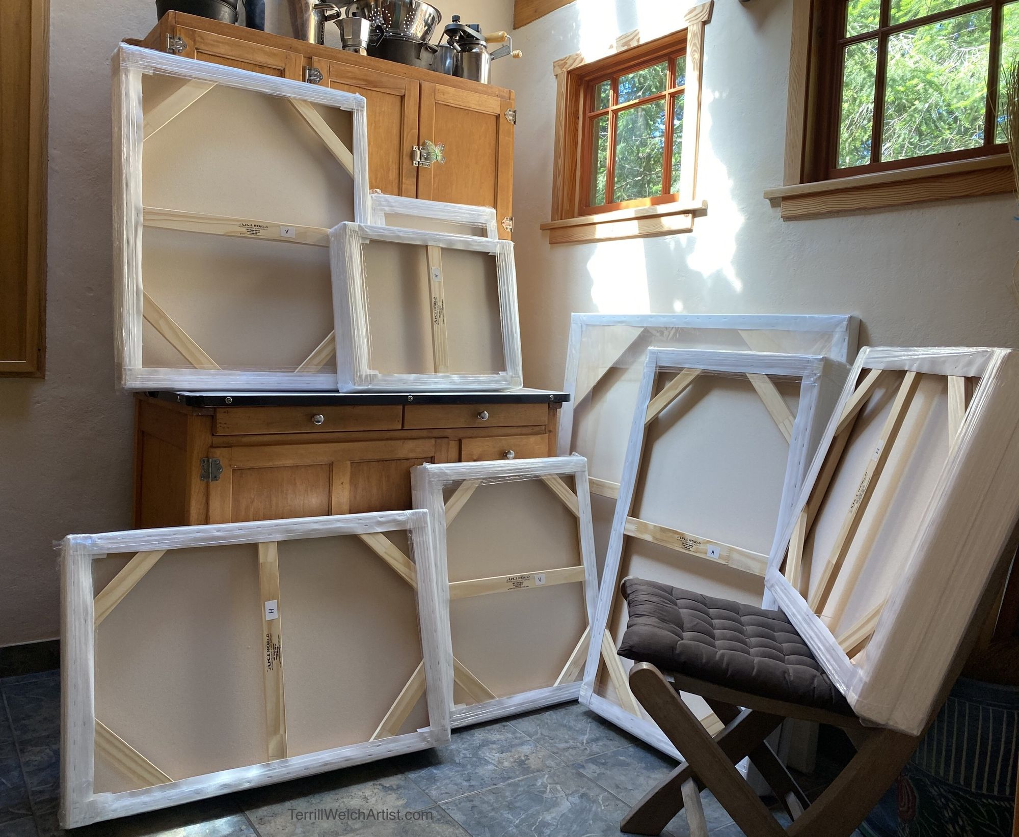 One of my secrets for plein air painting is to have everything ready to go so I can make my coffee and grab my painting backpack and go first thing in the morning or slip out in the afternoon with a peppermint tea and do the same. This week I had a session scheduled with a seven year old budding artist and her mom. While I was preparing the painting boards for this commitment, I put grounds on all eight of the 8 x 10 inch boards I had left. More will be ordered shortly.