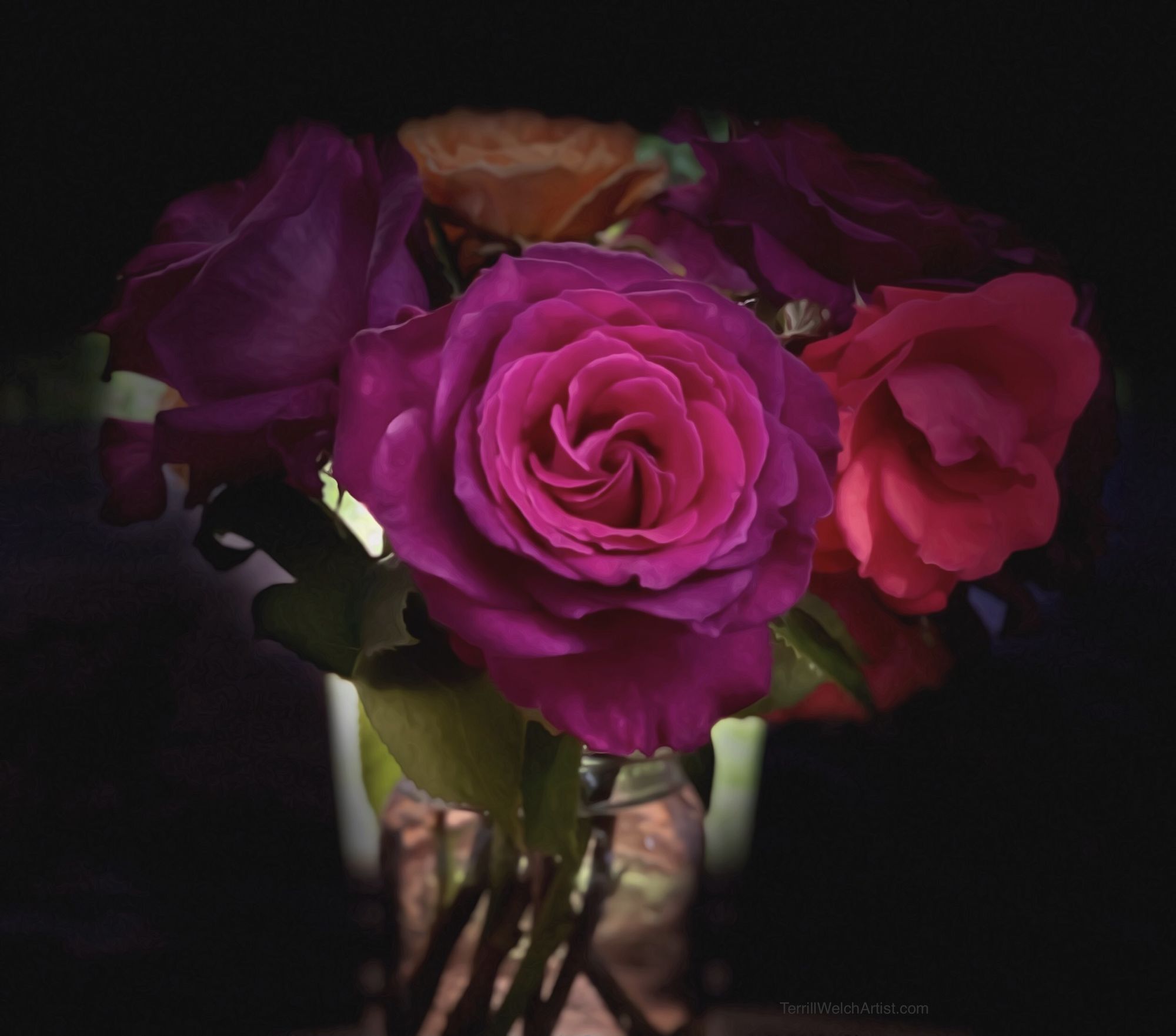 In between, I found time to play with some photos of the roses that were given to me by my daughter a couple of Sundays ago in the 30 degree Celsius heat. They were from her garden and traveled in our vehicles all day. The roses not only survived the trip but last over a week on the windowsill.