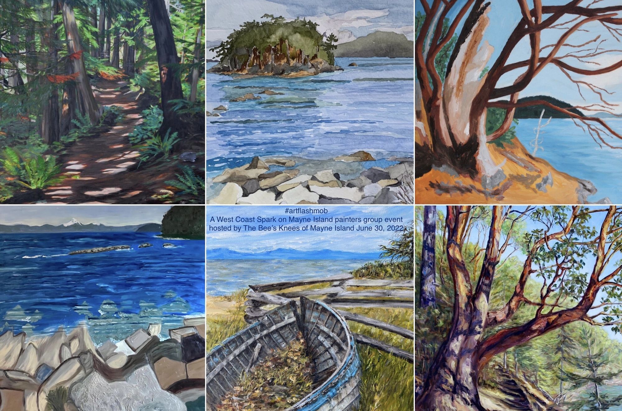There is an #artflashmob over on The Bee’s Knees of Mayne Island public Facebook group that I created over a year ago. Six Mayne Island artists from “A West Coast Spark on Mayne Island” painters group were able to participate. By all indications it was a successful event with 14 paintings being shared in two hours in what resulted in an instant online art show complete with descriptions and artist notes. Here is a collage of some of the work.