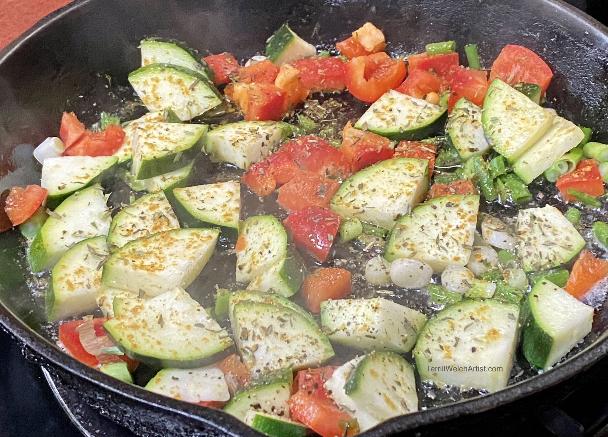 We have fresh zucchini from Hardscrabble Farm heated through in the cast iron skillet with olive oil and a bit of butter, part of a red pepper from Farm Gate Store and onions and fresh round shelled delights from RavenVale Farm. The herbs in this case are a dried mix from France with a light sprinkling of a medium curry powder and salt and pepper. We added the end of a baguette with butter and café solo (dark roast black coffee by itself).