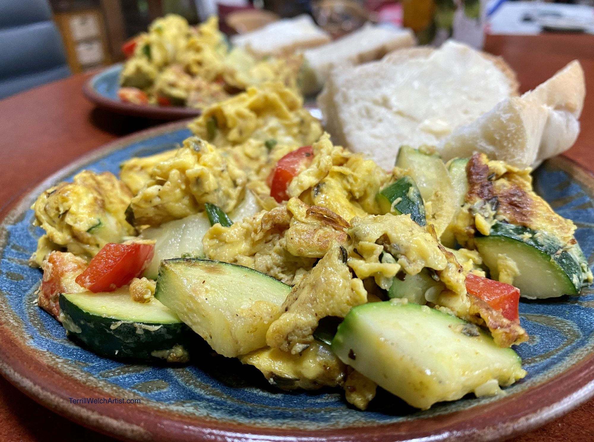 One of our La Casa de Inspiracion late breakfasts is attributed to a lover of my youth from Sri Lanka. This scramble is made with whatever herbs, curry spices and fresh veggies are handy and crack those beauties to scramble with a fork and a bit of heavy cream. It was first served to me with flat bread and black tea made with warmed milk and three, yes three, teaspoons of sugar per cup. I still shudder a little at the thought of that tea! 😂