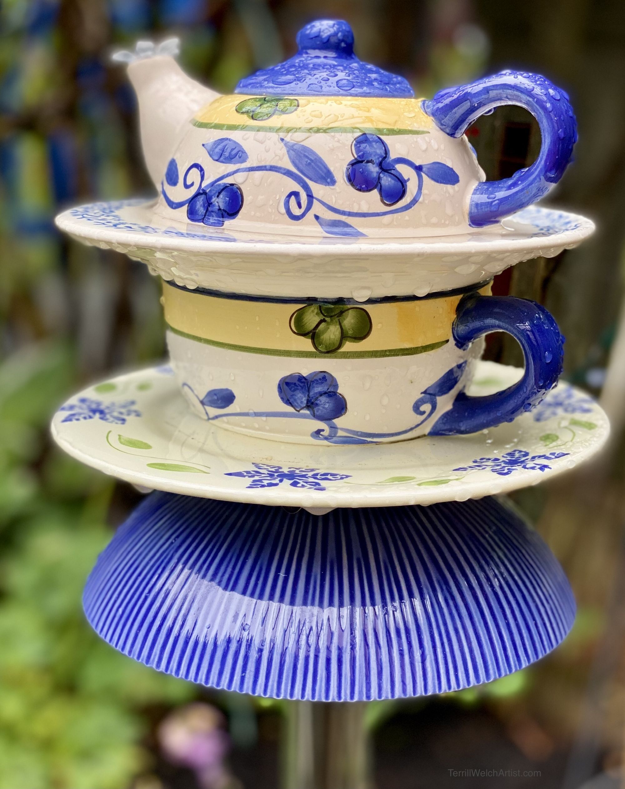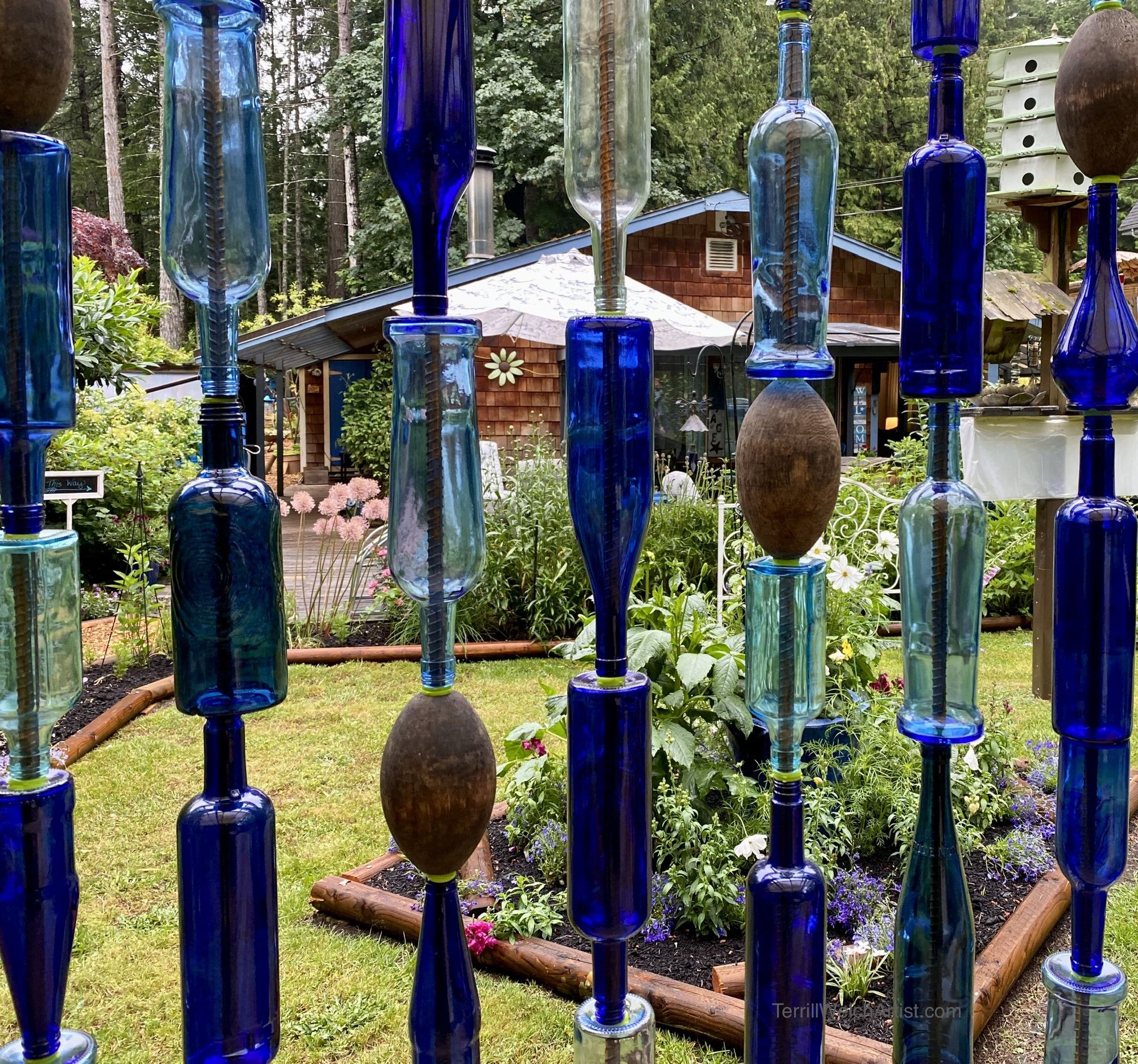 A unique garden sculpture featuring the owner’s signature passion for blue seems to sail along beside the path.