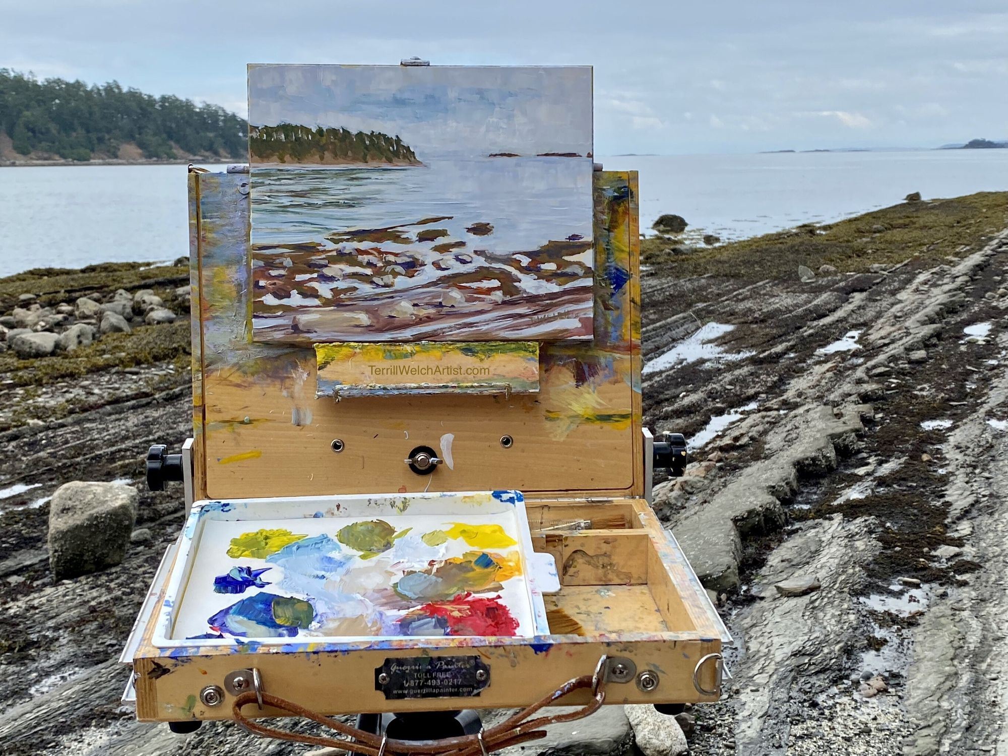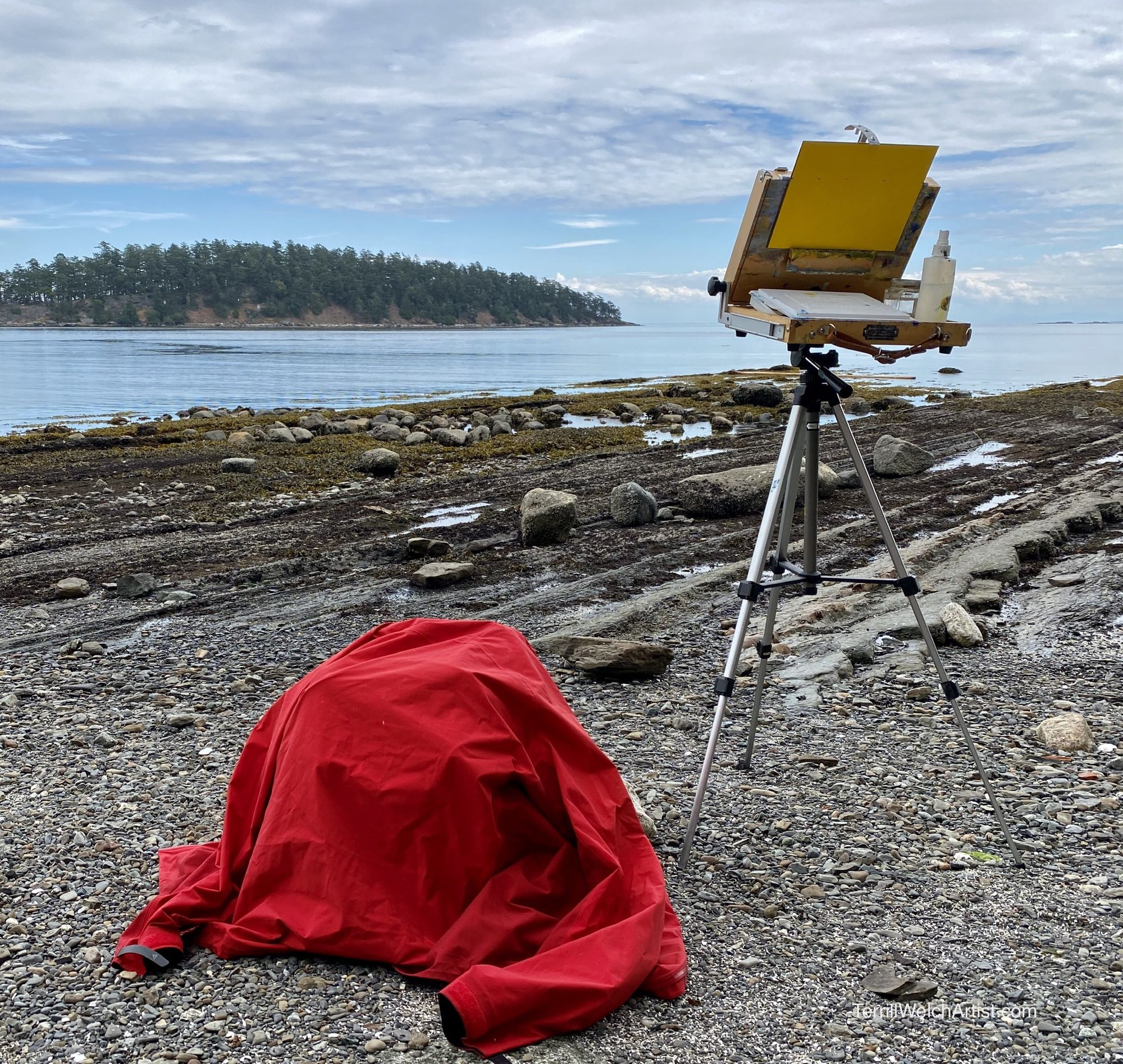 There were these little spitting showers but it was warm so I thought I would attempt a plein air painting down at the end of Seaview road. I got everything set and began my painting like this…