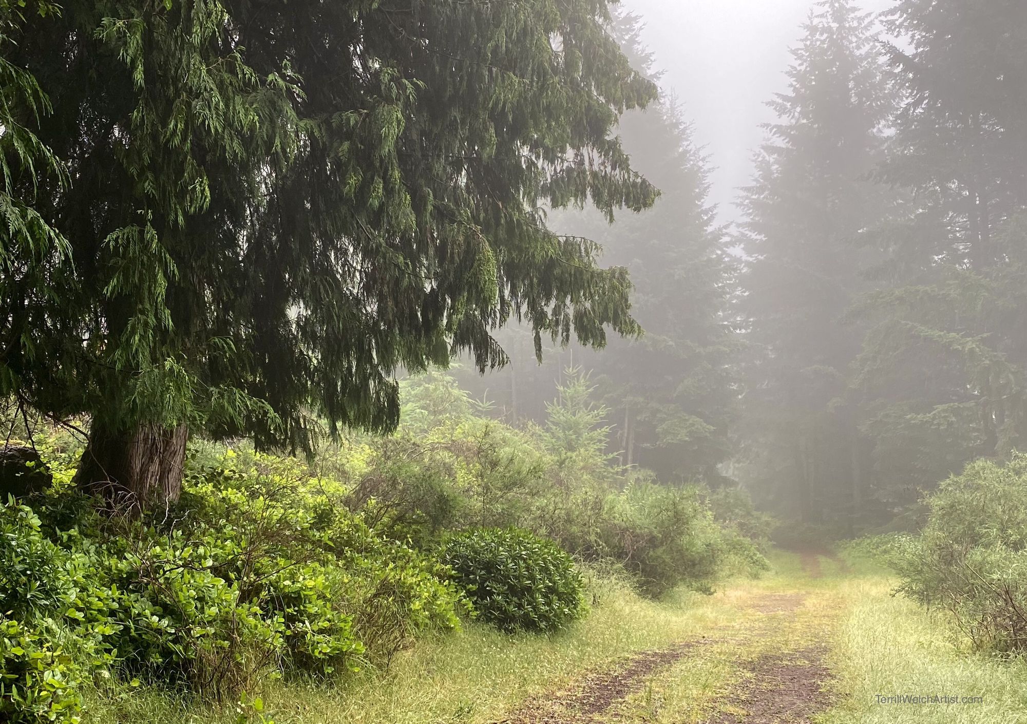 Through the mist I strolled down the old road in the park. I am slightly later than usual this morning. I hadn’t been sure I would walk today in the damp but I am glad I did. A deer snorts at the far end of the trail and bounds into the salal. Ring neck pigeons coo in the tall cedar and fir trees along the path. There is an owl hooting farther away, possibly confused by the heavy mist into thinking it is still night. Then there is me. I have a cotton tote pulled up across my shoulder so it doesn’t slide while I walk… and think.