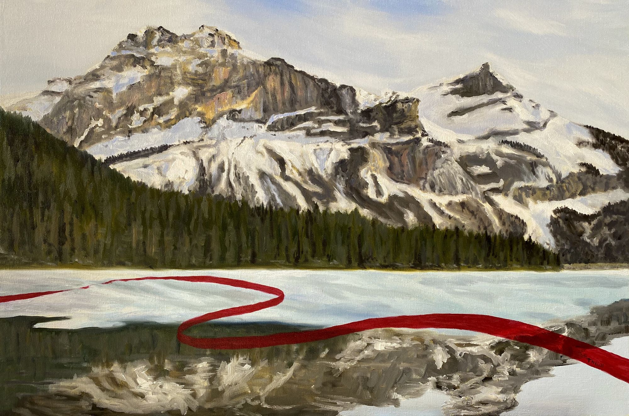 Artist notes: Emerald Lake is a compelling mountain location with a lovely body of water below. This work started with a plein air study. The broken part of the red line is to leave a little bit of hope in our ability to change our behaviour in the face of the consequences from environmental impacts.