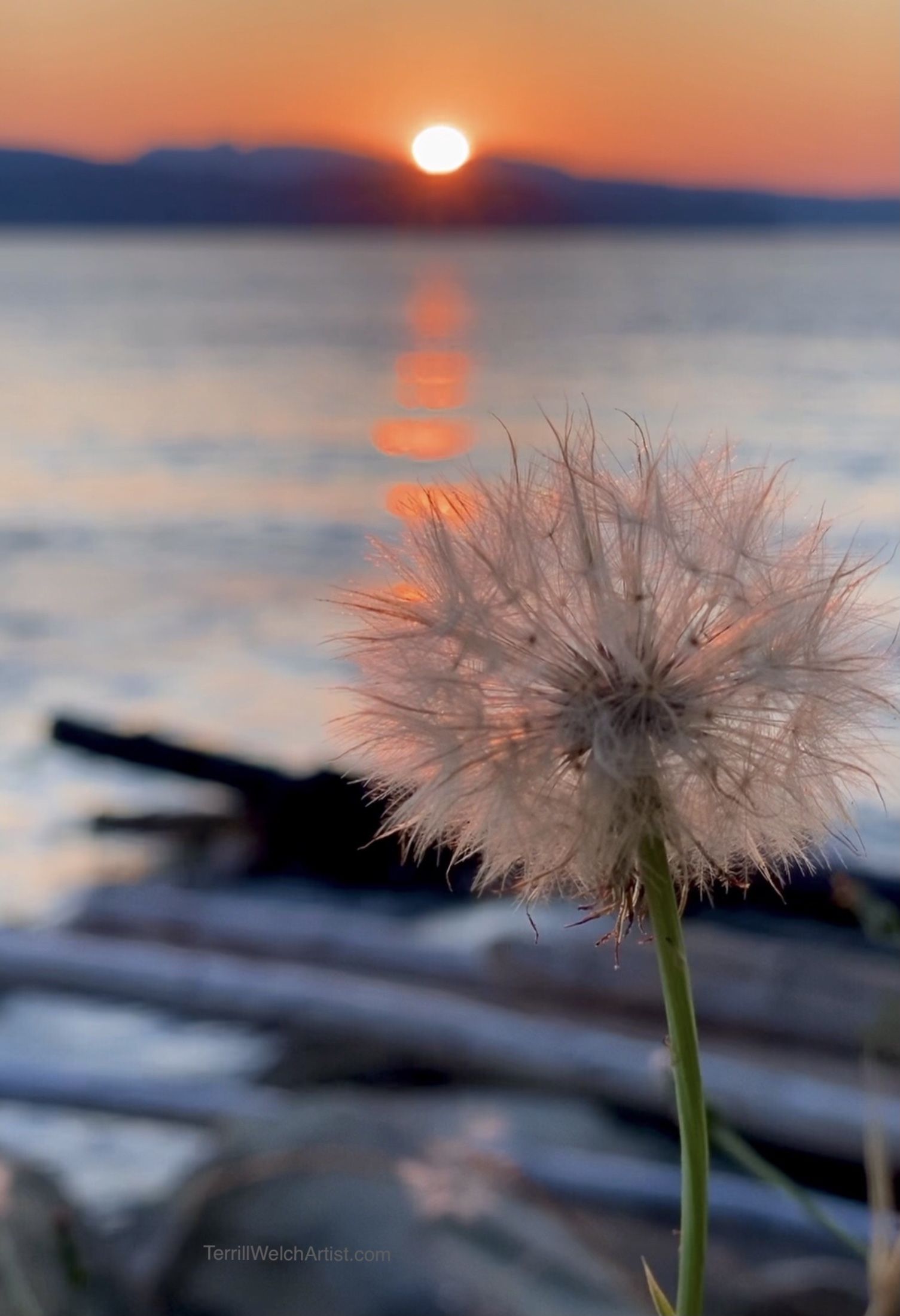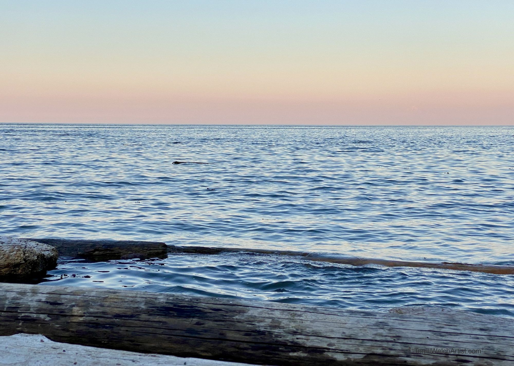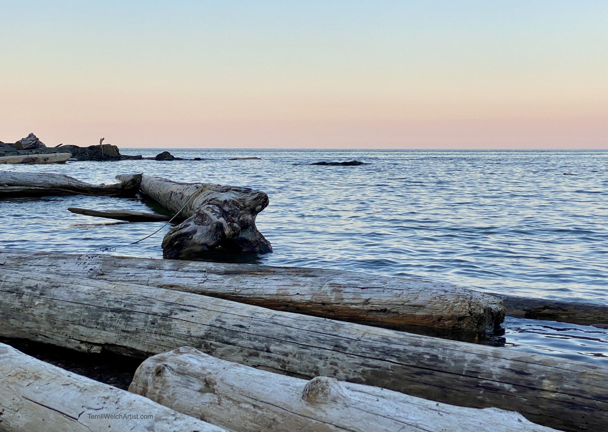 On a rising high tide, logs rolled against the shore. We stayed in the easterly stillness for a short while and then slipped off in the other direction towards the setting sun.