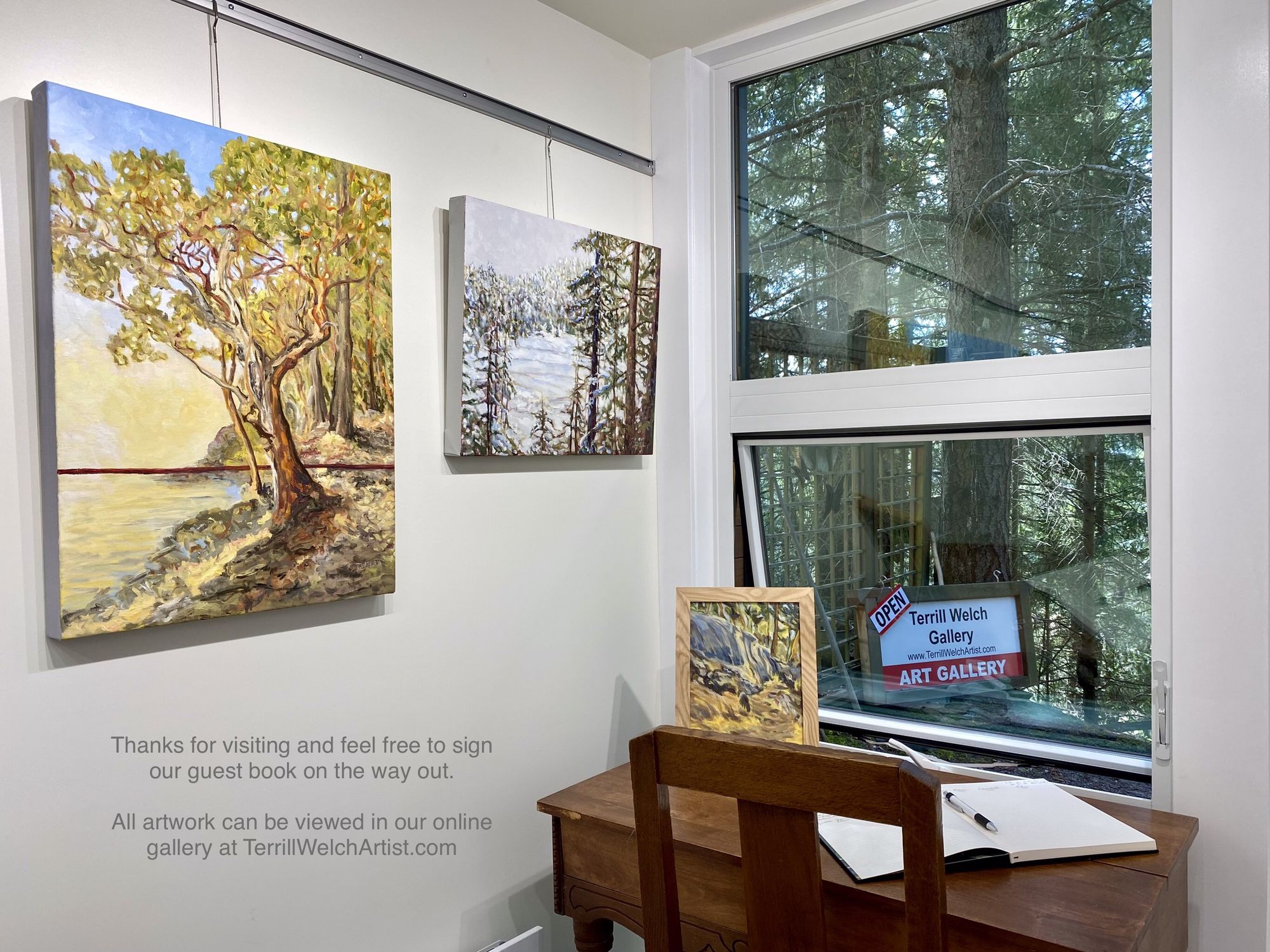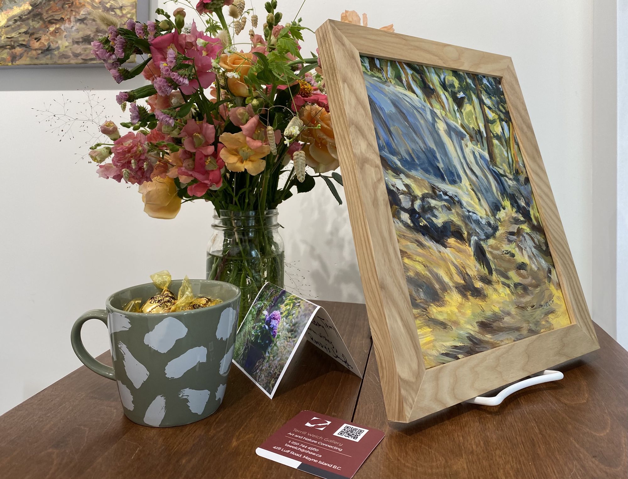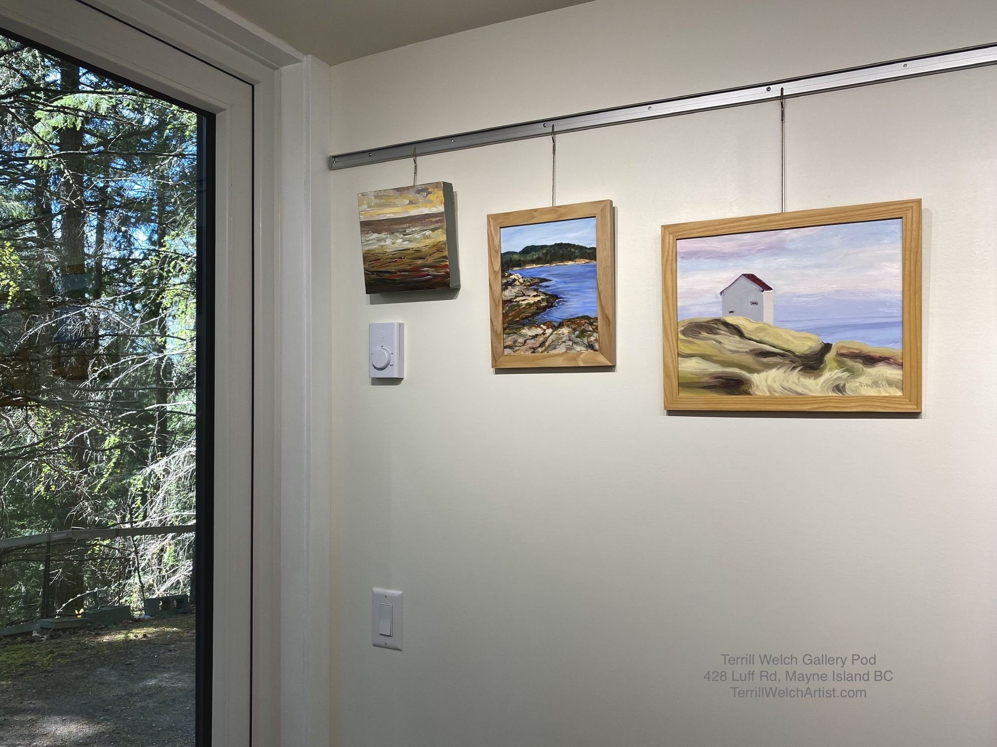 The non intrusive road signs are up as well. However, there are directions on our website with a map for finding your way to the Gallery Pod and Home Studio at 428 Luff Rd, Mayne Island HERE. This map also shows where to find our other Terrill Welch Gallery adventure – the ISLAND TIME ART room located at 492 Dalton Dr. in the Dragonfly that is in the blue building above the ferry terminal in Village Bay. ISLAND TIME ART offers smaller original paintings and usable art such as totes, aprons, greeting cards, coasters, zipper pouches and more. Between the two locations we can offer great options to consider for your art collection and gift giving needs.