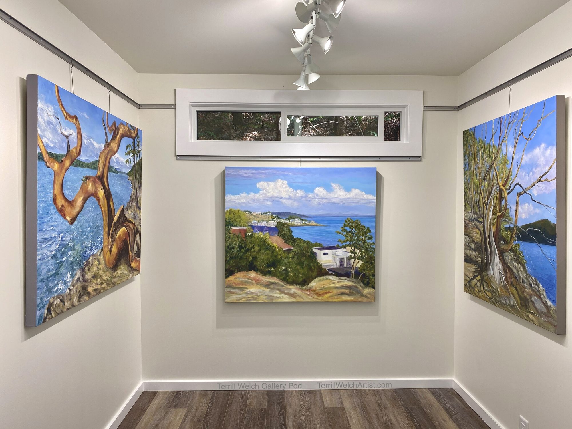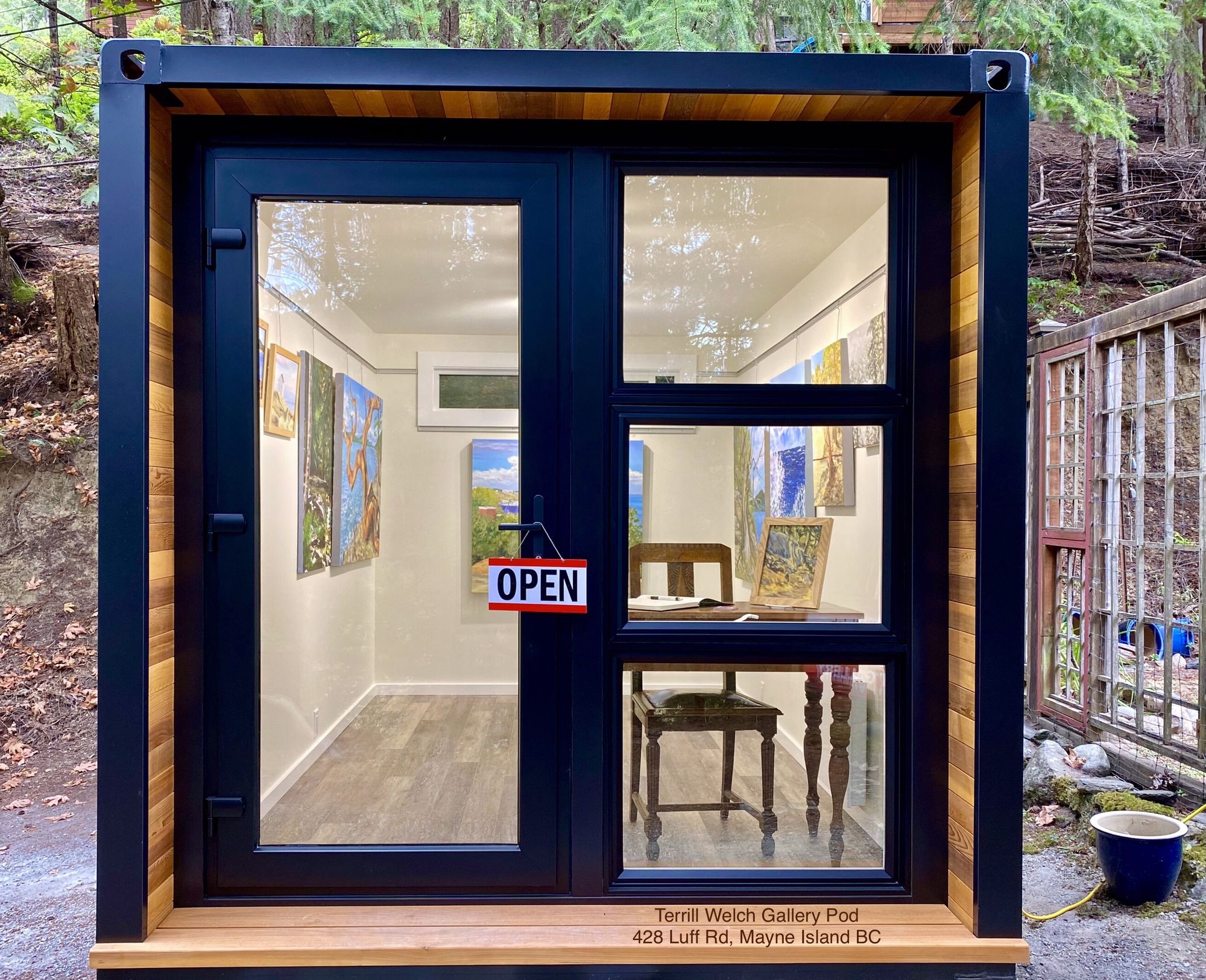 Once upon a time there was a Canadian contemporary landscape painter, Terrill Welch, who needed to create a new gallery space on small rural Mayne Island on the southwest coast of Canada, right in the middle of everywhere. She thought and thought and considered and then considered some more. It was the end of October 2021. The commercial space that she had rented since the summer of 2017 in Miners Bay was closing and she needed to secure a new show space for her paintings and those of the other artists she is showing with the gallery. What could she do? Commercial space was extremely limited. In a swish of inspiration during a sleepless night, she had an idea. Terrill thought “what if I was to use a small container designed for this specific purpose and placed it at the our front gate?” Then she set out to make it so.