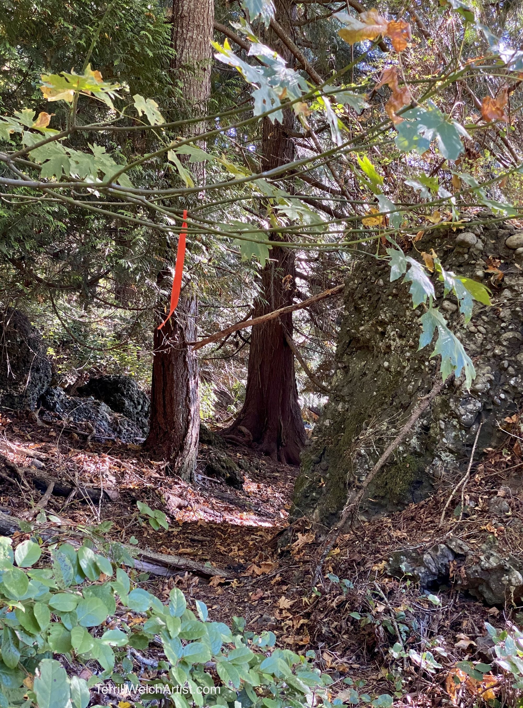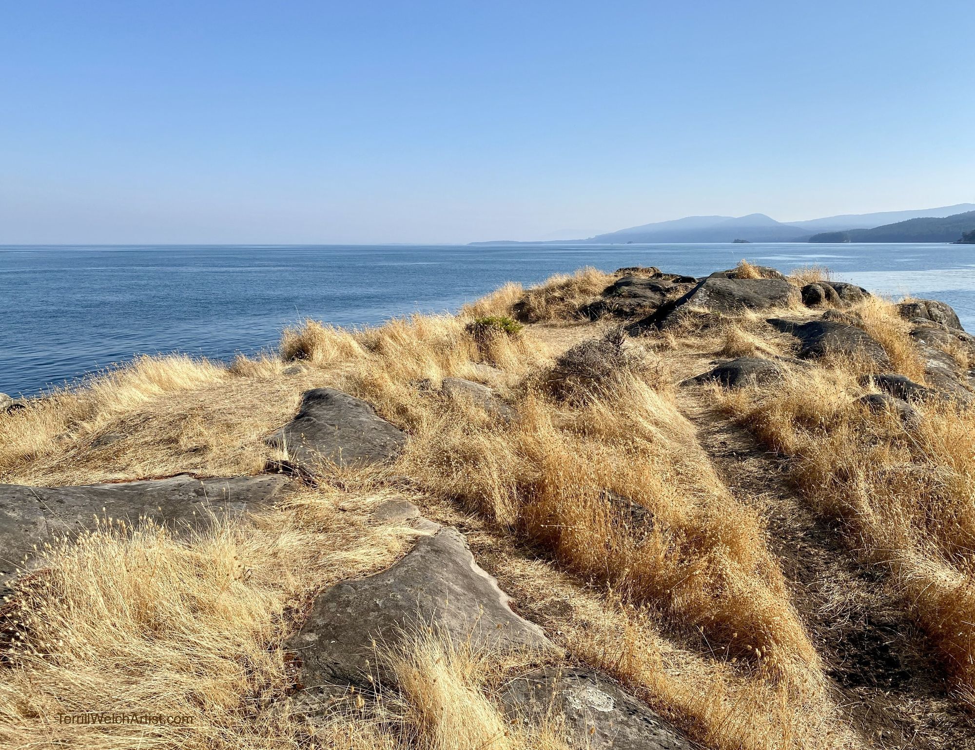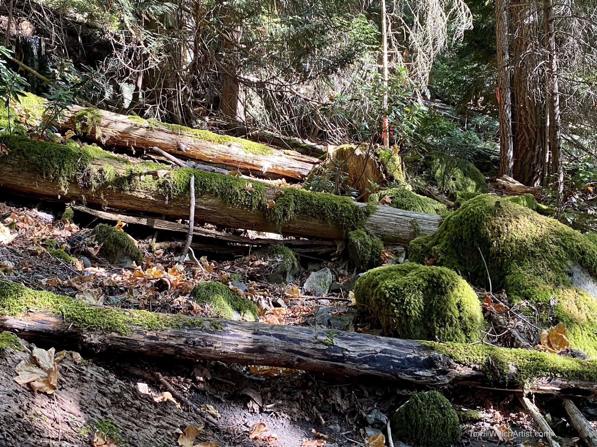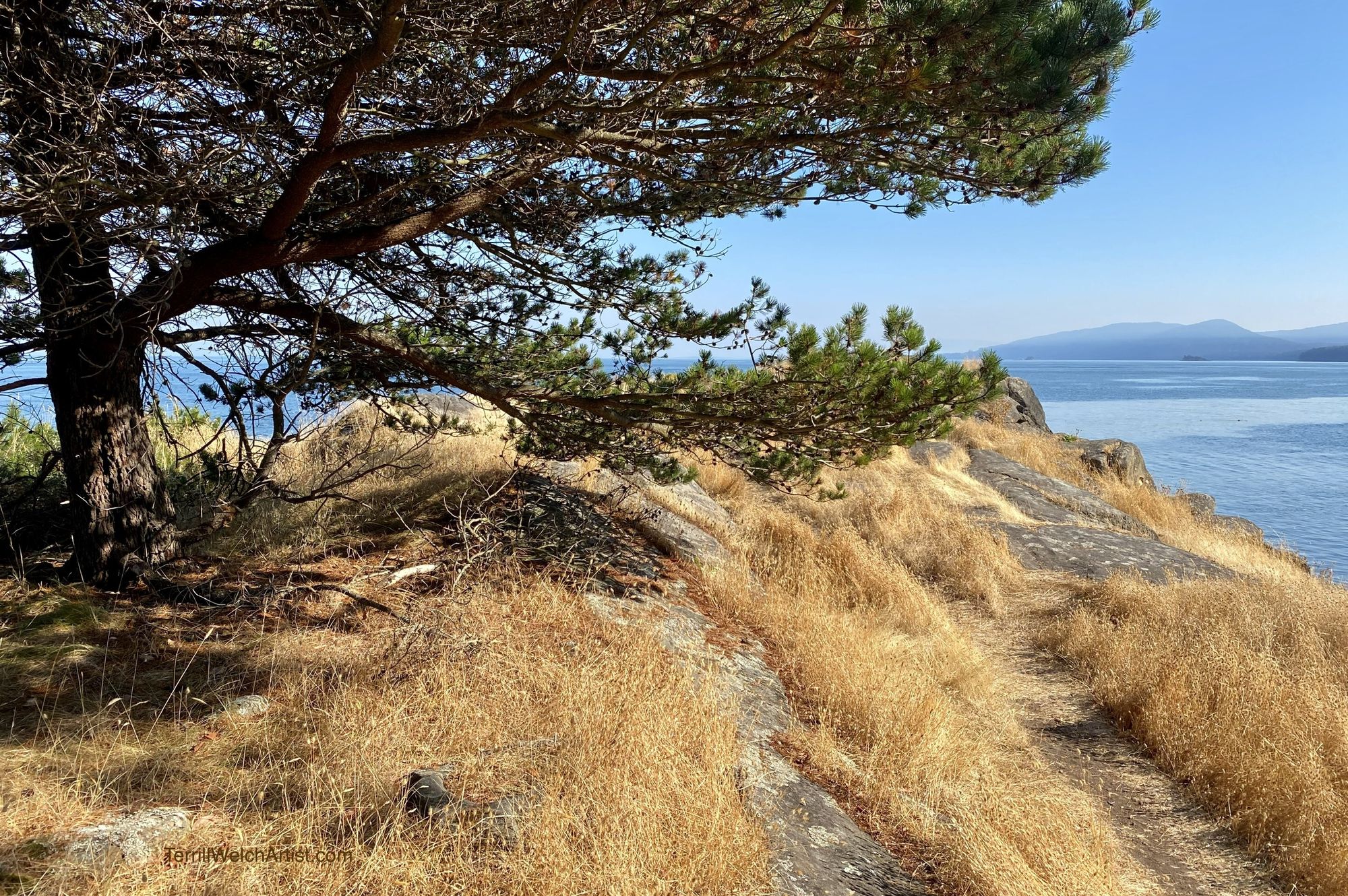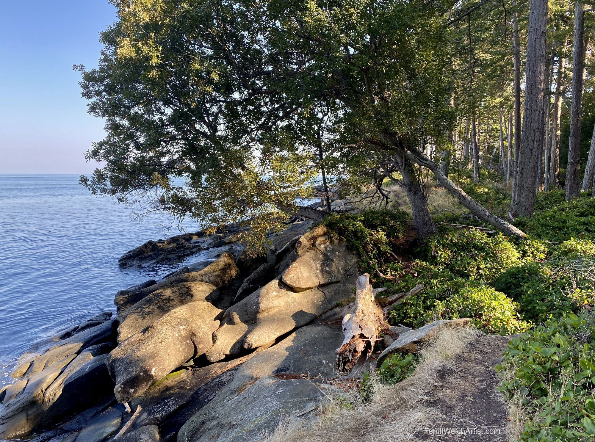 The low autumn sun has chased me into the last possible space of my less than ideal south exposure painting studio and crept onto the canvas. In frustration, I give up and wash my brushes. Then I tie up my hiking shoes and escape to the sea. The familiar forest middle trail eventually leads me in a steady easy rhythm out to seashore.