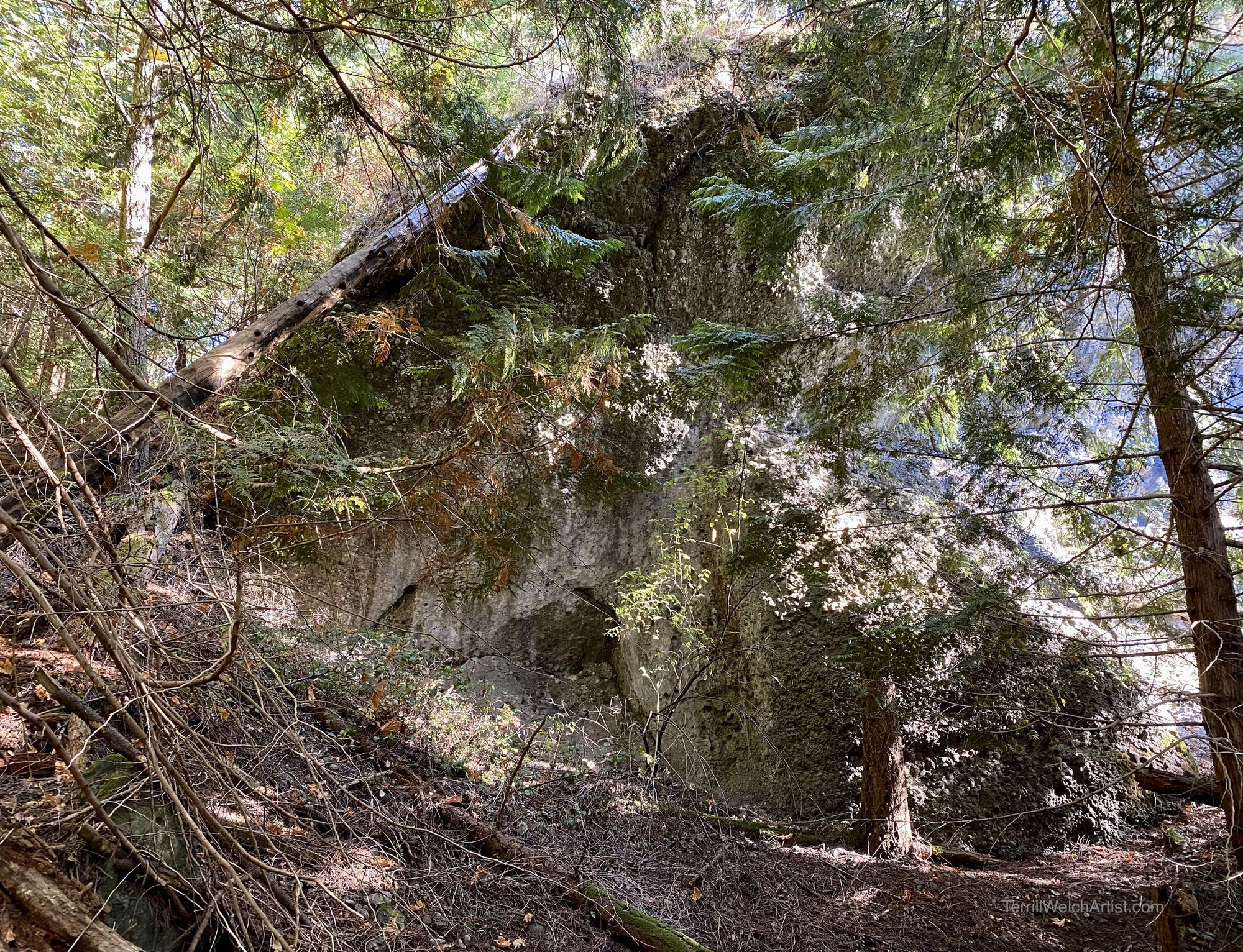 Eventually the trail meets up with terrain I am familiar with from previous explorations and the path slips between the imposing cliff face.