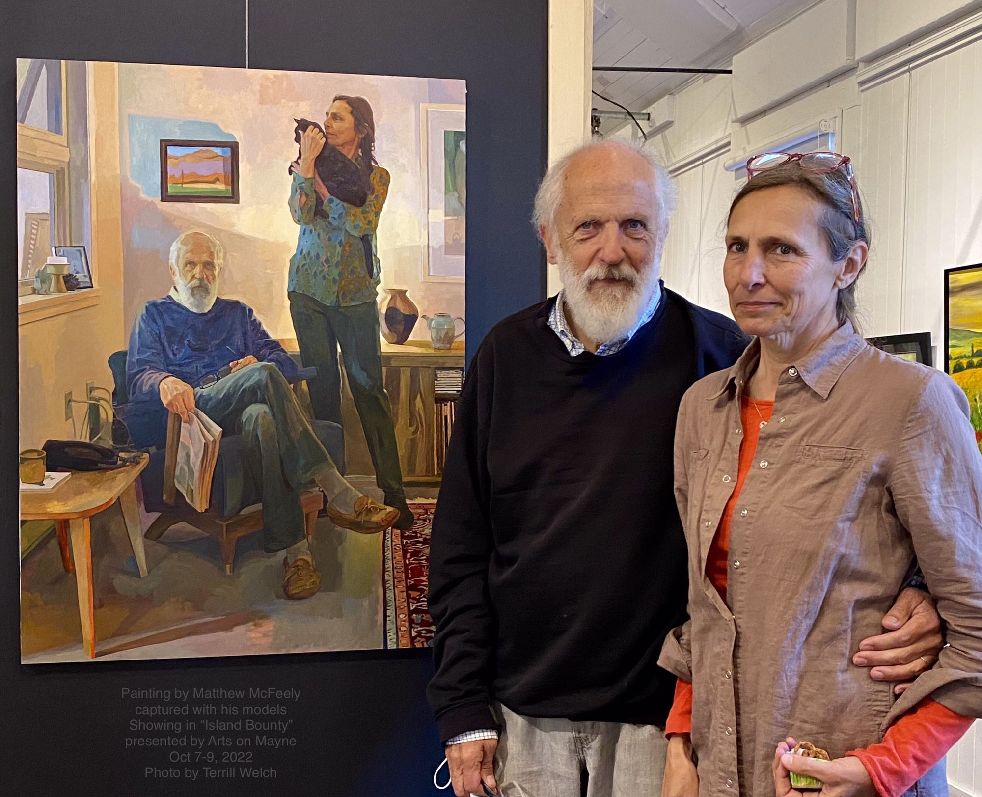 We got lucky due to the keen eye of Jessandra Phillips who spotted the couple in the portrait visiting the show. She recognized them even with their masks on and I quickly asked if they would mind getting their photo taken with the painting. Being the best of sports they agreed and I have permission to share this impromptu moment with you. I am hoping that we shall see more Matthew’s paintings in the future.