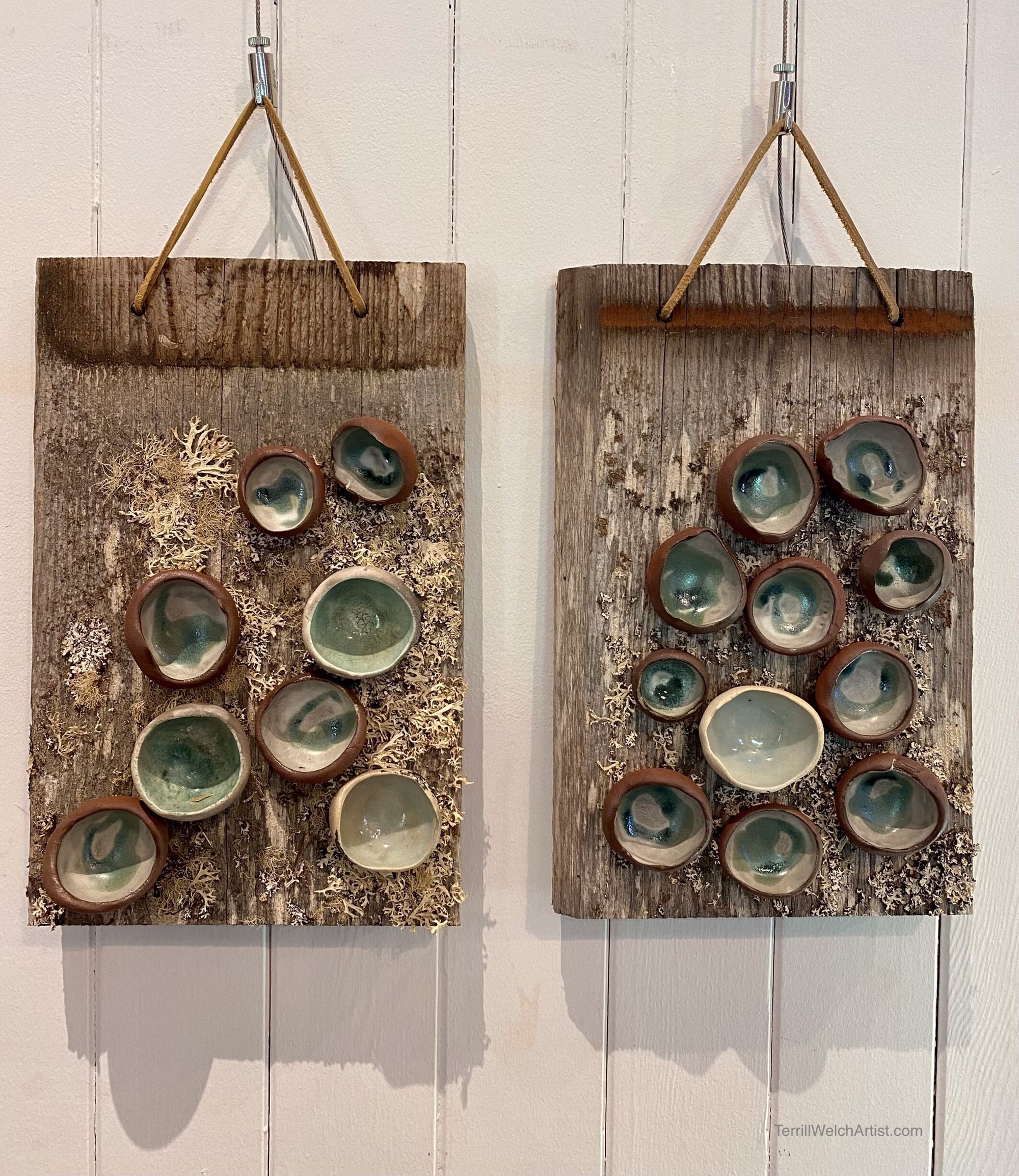 Not wanting paintings to get all the attention, I want to share these wall hanging sculptures by Kristine Webber with Mayne Island Clay Works. I love how they quietly command the wall space.