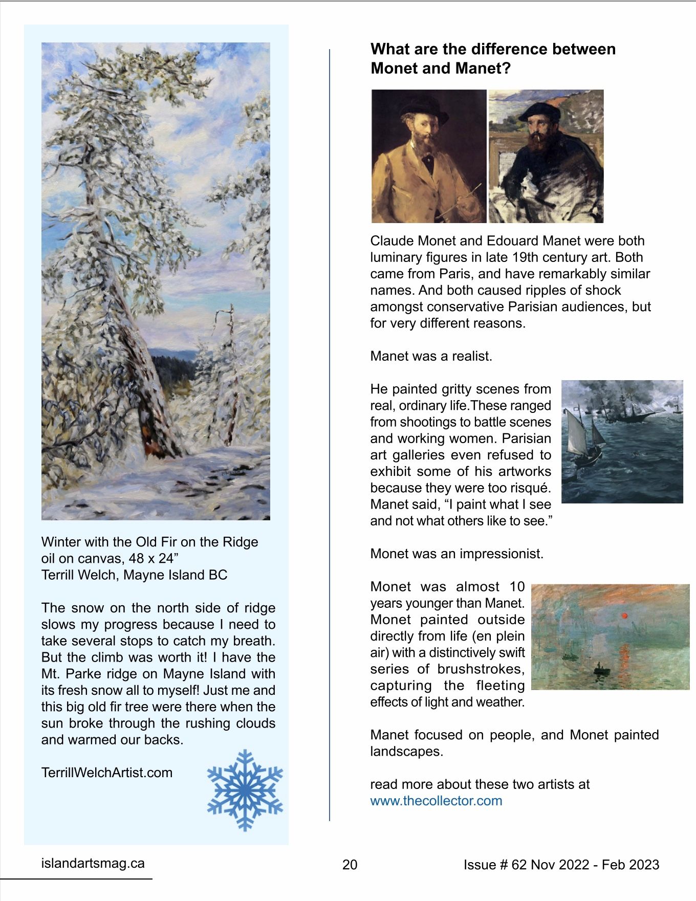 The second mention was a feature of the “Old Fir Tree in Winter on Mount Parke” painting in the Winter 2022 issue of the online Island Arts Magazine that reaches from coast to coast in Canada and is owned and published by Canadian Fine Artist Susan Schaefer.