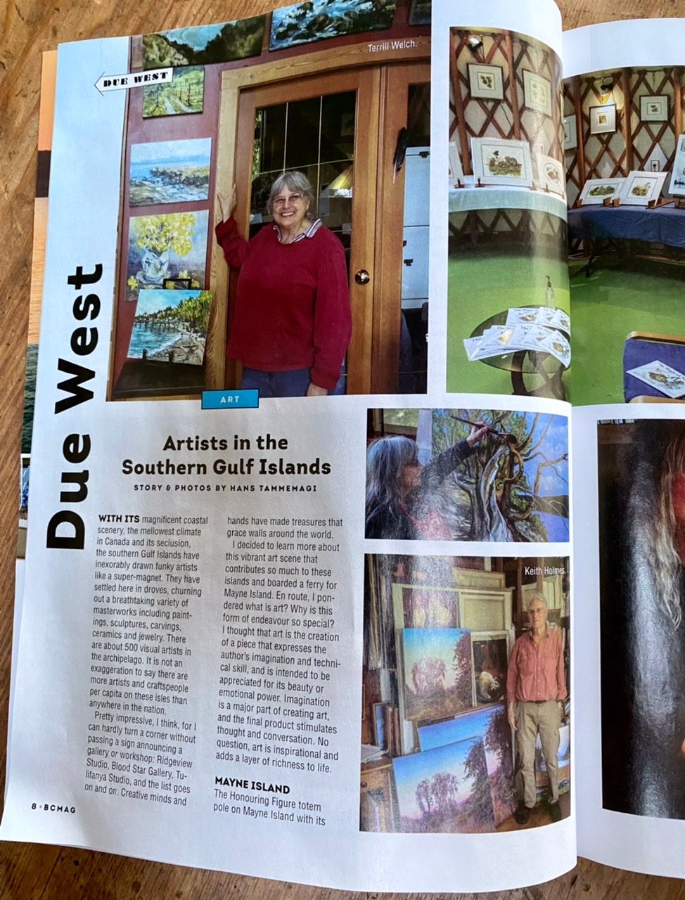 The first mention was in an article by Hans Tammemagi in the respected British Columbia Magazine, summer issue 2022, along side a few fellow Southern Gulf Islands artists including Keith Homes, Morgan Warren, Stan Oglov, Robert Bateman, Donna-Fay Digance and Judy Weeden.