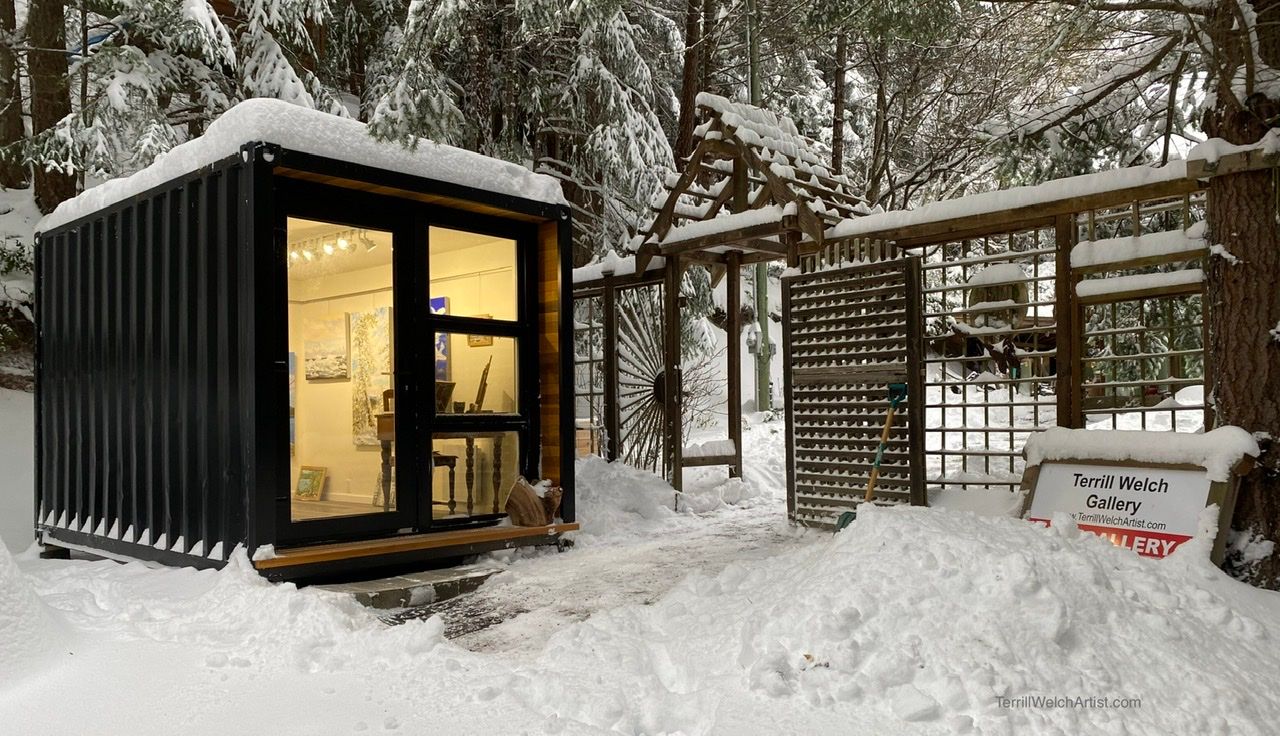 I take a long pause over a recent photograph of the December snow-covered Terrill Welch Gallery Pod that arrived in the middle of August and has been showing and finding homes for paintings every since. In fact, the gallery pod has been a huge success and it is a perfect fit for my painting practice at this time.