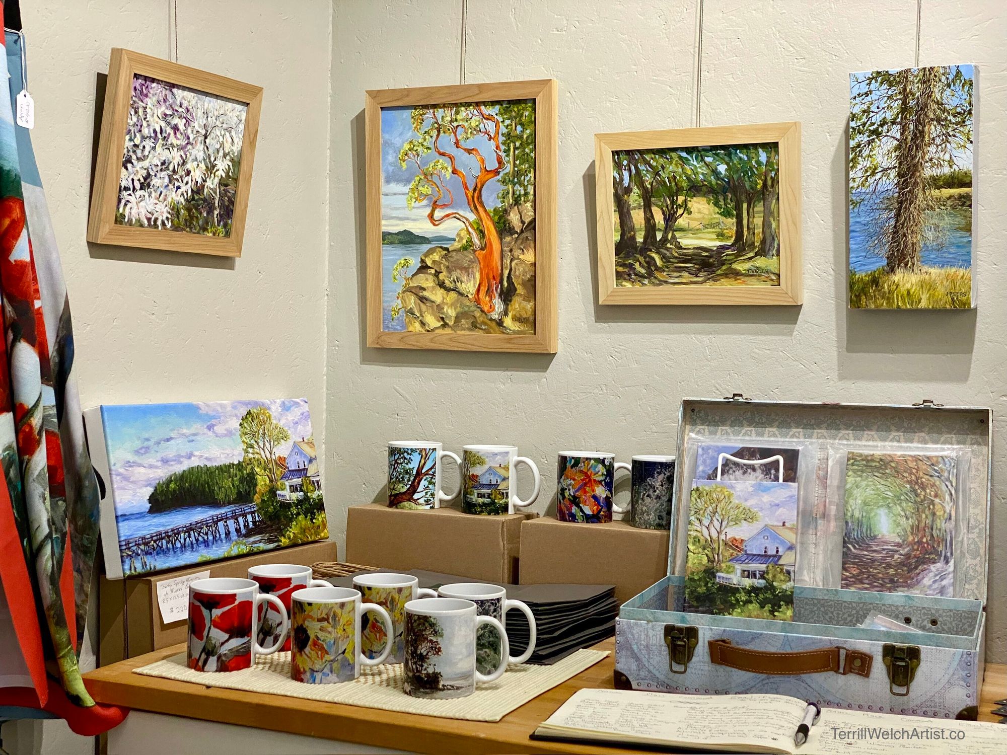 This past week, these two Terrill Welch paintings are winged their way to a special home in Alberta, Canada. With gratitude, we offer congratulations to the art collector who is celebrating a milestone as she reaches towards her vision! When we asked our art collector about her selection of these two paintings, she replied that she was following her joy. Doesn’t that make you smile? Joy is such a full body experience and it is something that we know when we see it both in people and in animals. Joy is also contagious and seems to spillover onto and into anything within its sphere. With our southwest coast weather finally warming up I feel that abundance of early summer joy that comes with the change in the smell of sea and in the forest as the resin in the fir trees warms and the foliage burst out on the maple trees.