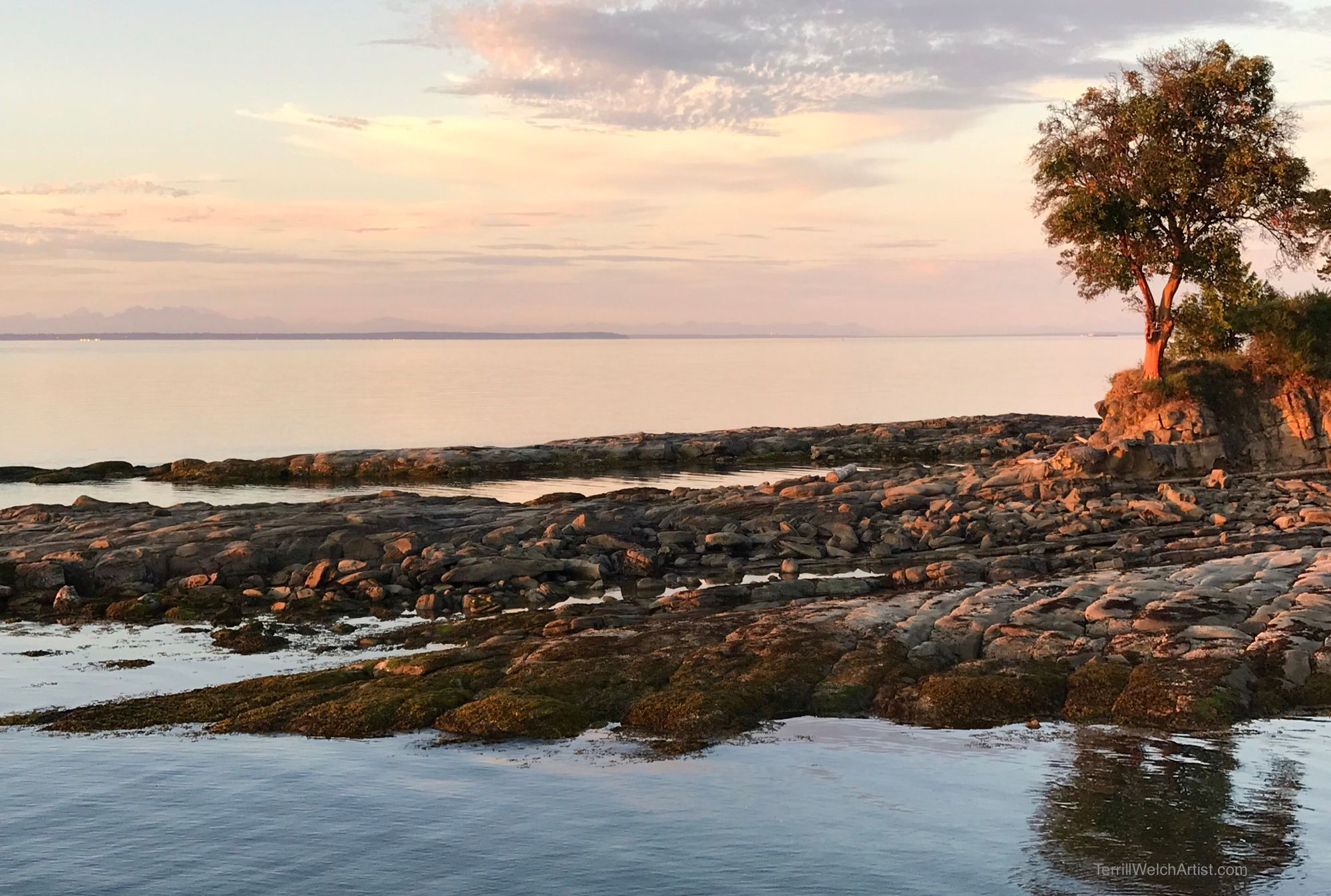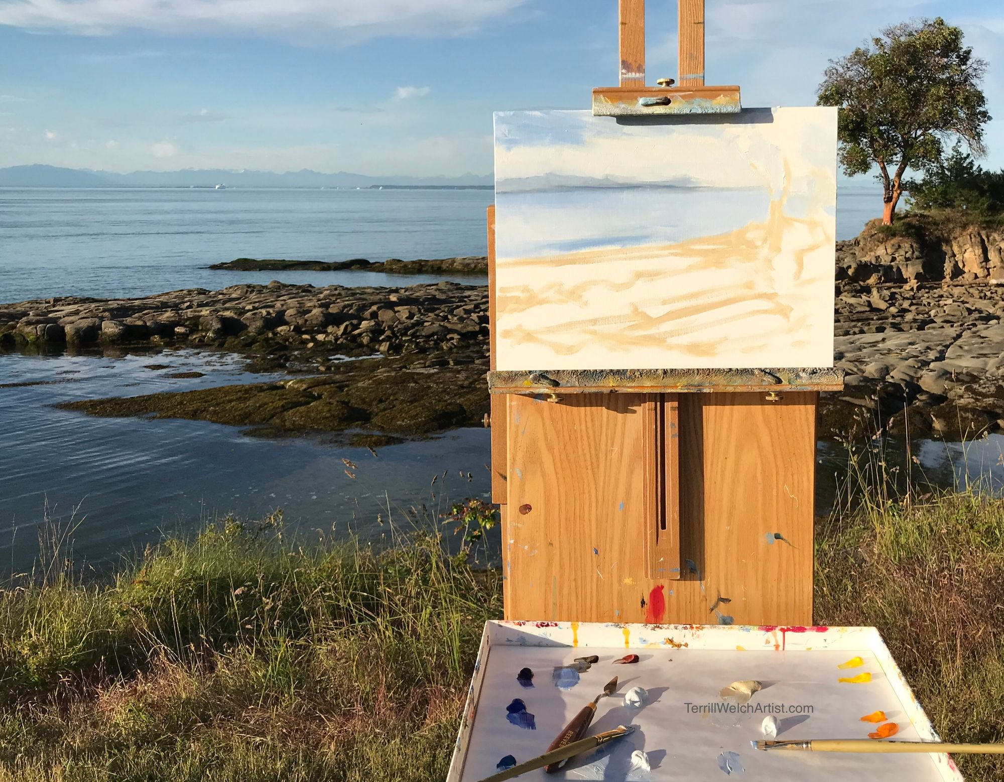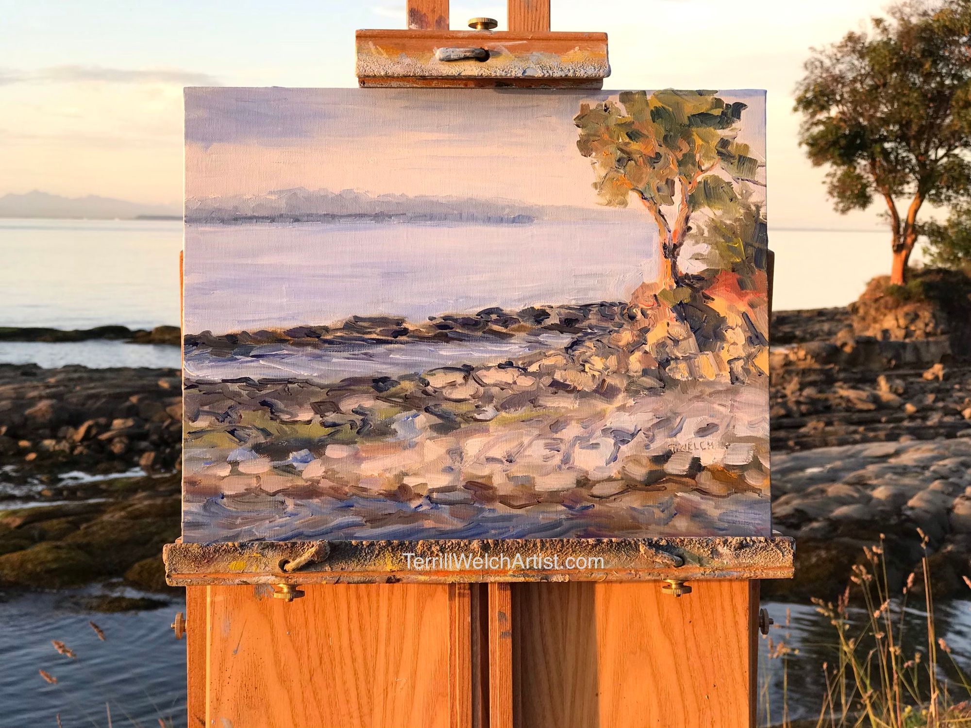 From beginning to end, my evening plein air by the sea at Georgina Point on Mayne Island. What ended up on the linen board seems merely incidental. (When I was done, I left it safely in the back of the car overnight and decided to look at it again later to see what was really there.)