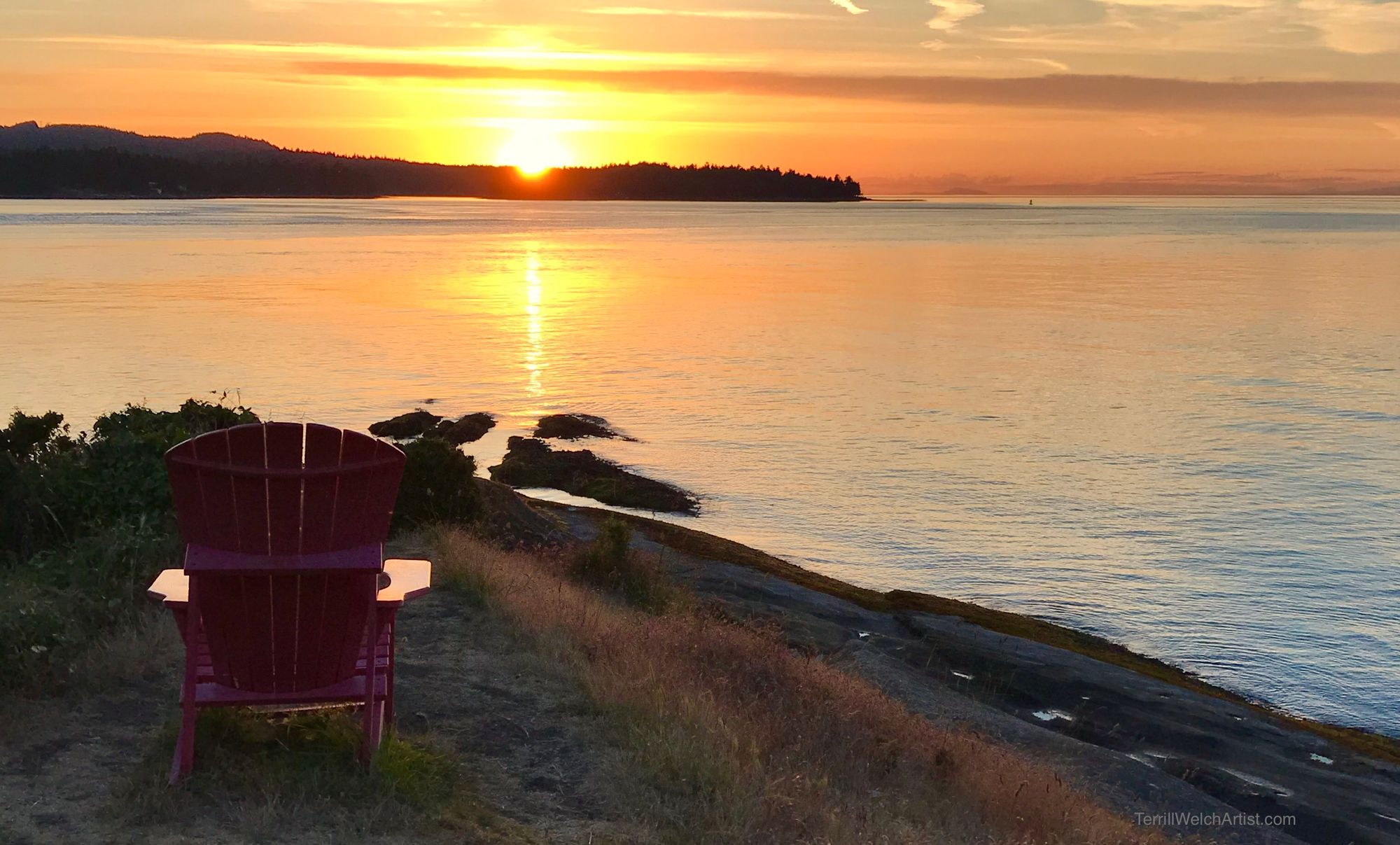 By 9:07 pm I am all packed up and take a moment to sit in the red chair as the earth turns and the sun dips below the horizon. A good plein air painting day! :)