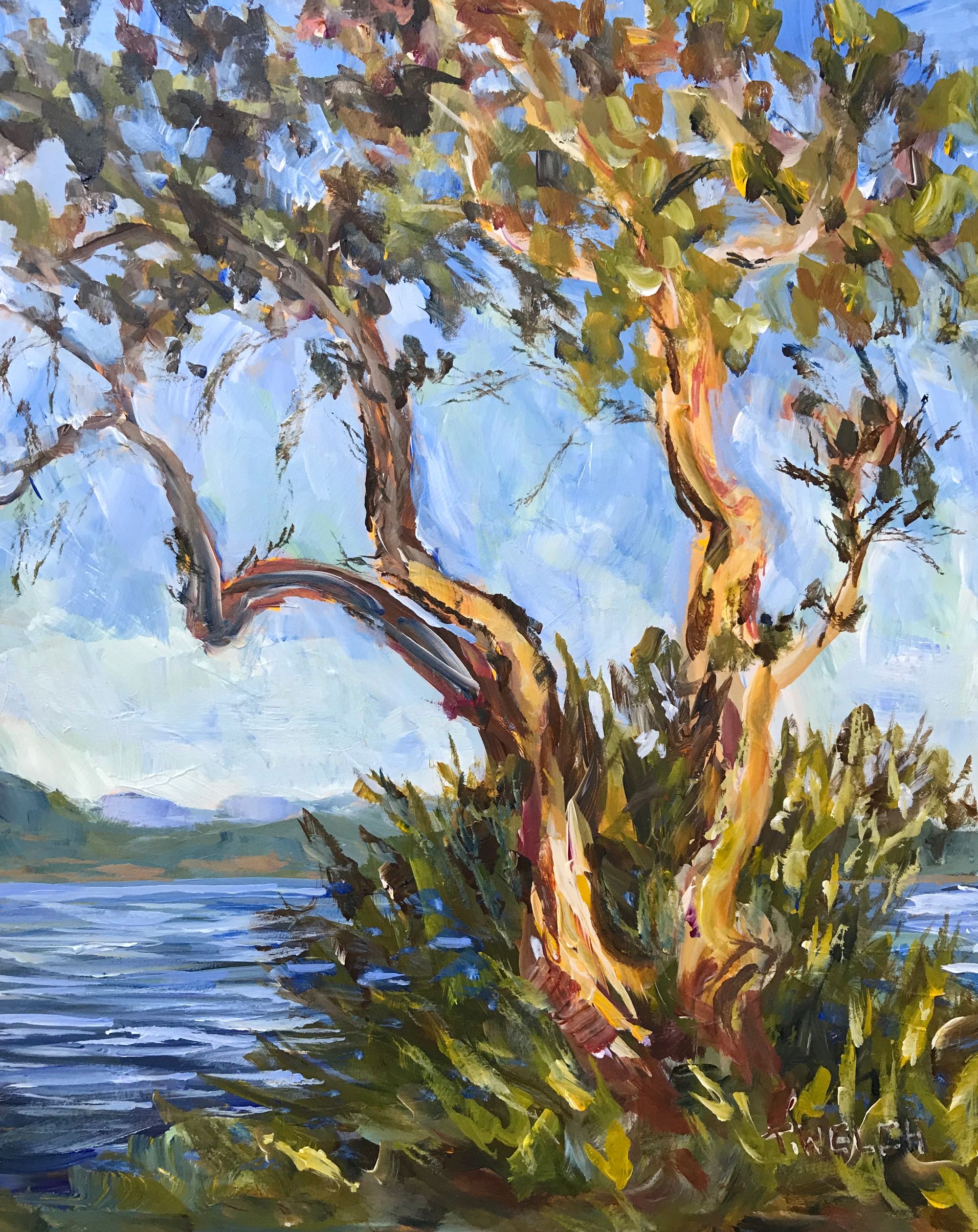 “Arbutus Over Sansum Narrows Salt Spring Island” by Terrill Welch 10 x 8 inch acrylic on gessobord.