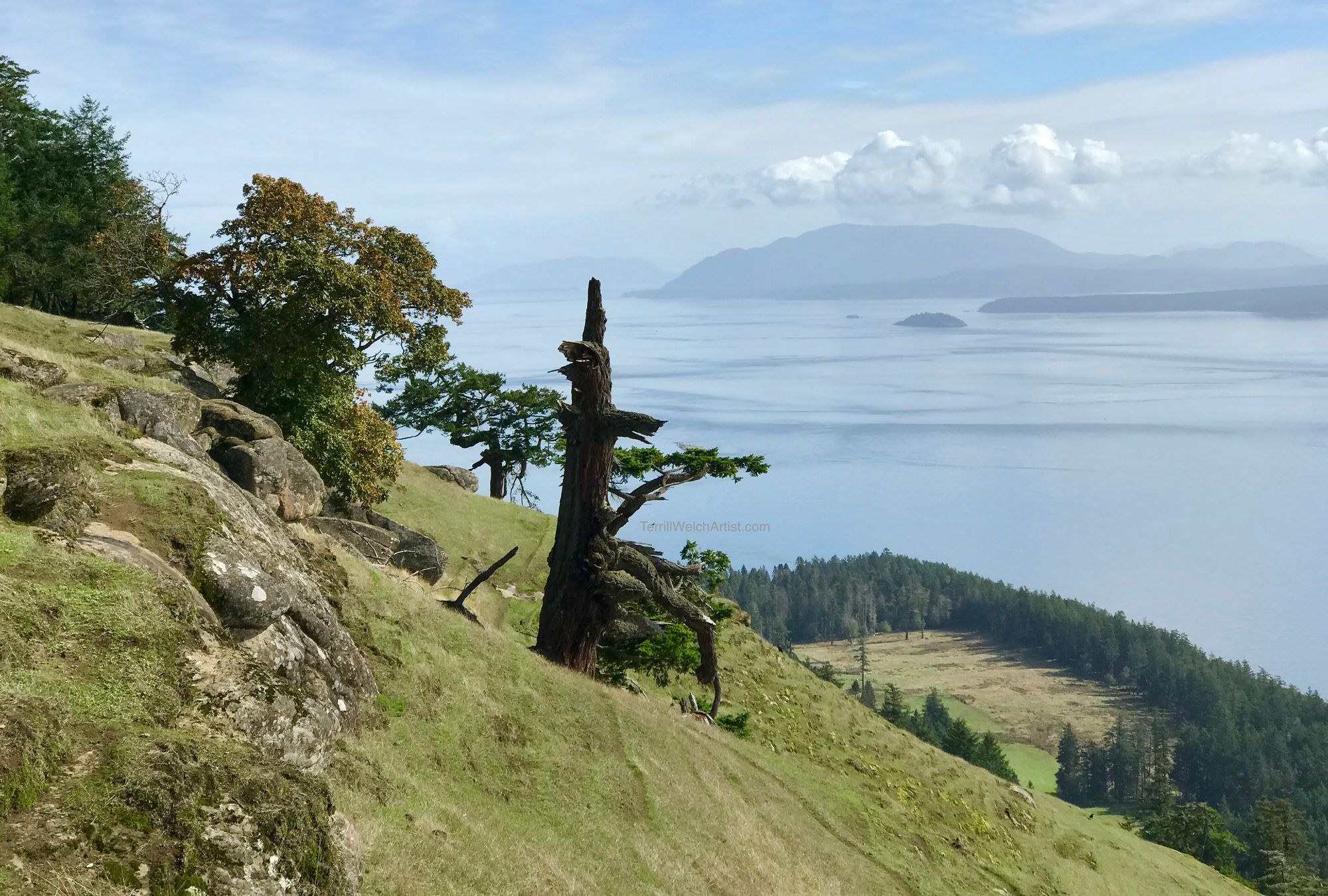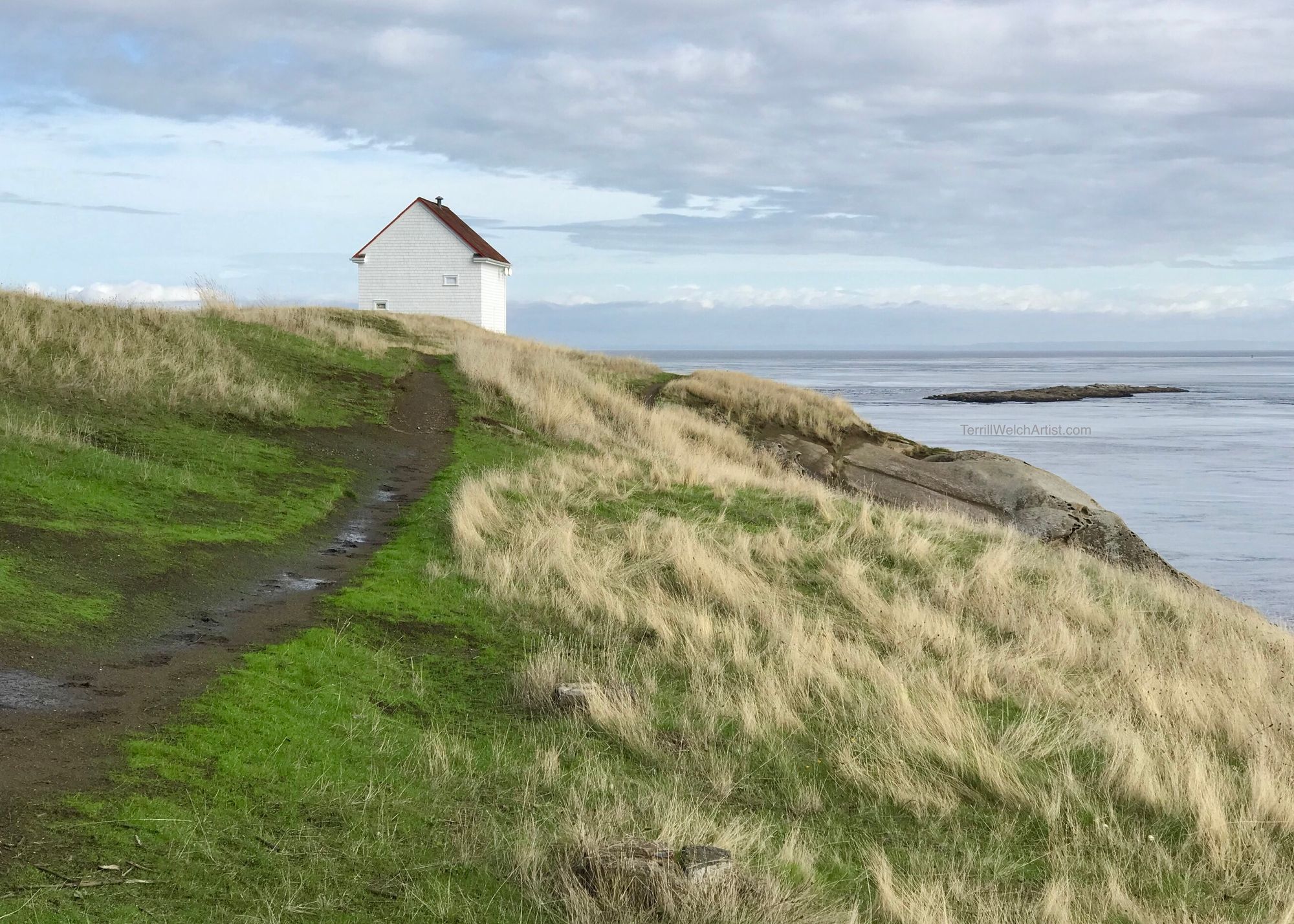 Notes from the artist: The mist turns to a light drizzle as I sit on a low chair looking out past the cedars to yet other islands across the sea. What can possibly cut through these west coast greys? Then I remembered.