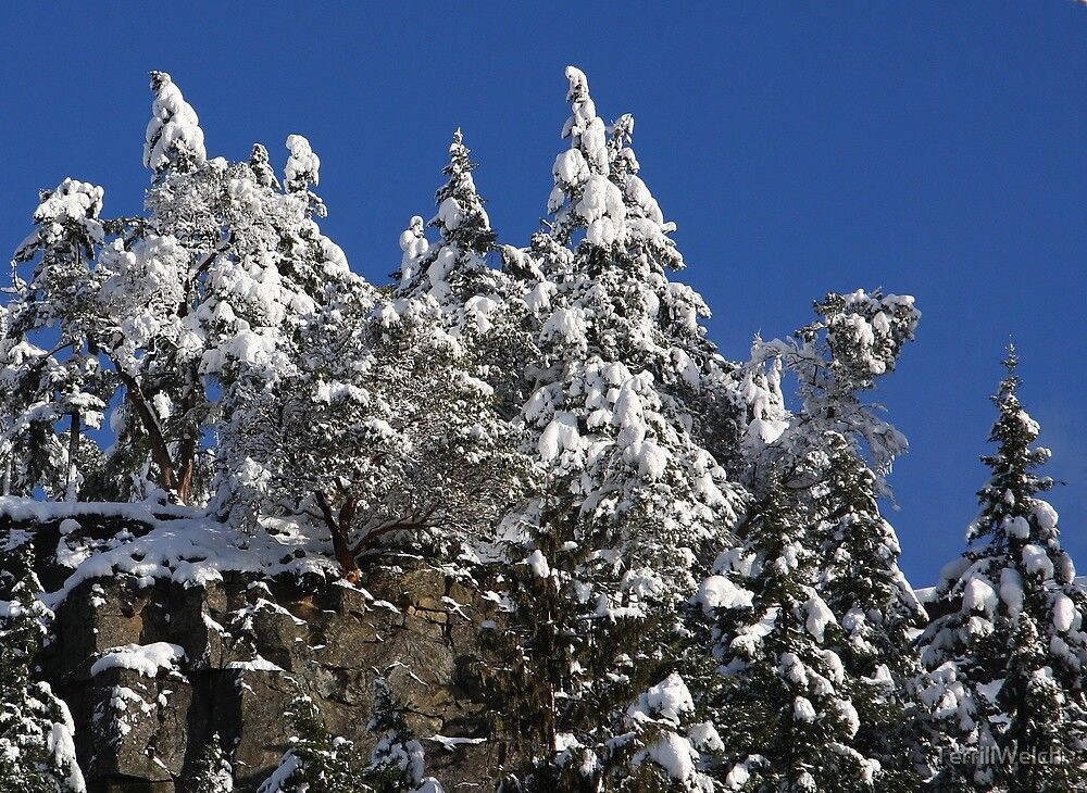 Fresh heavy snow on the cliffs behind our house looking north with a low winter sun to the south in the early afternoon.