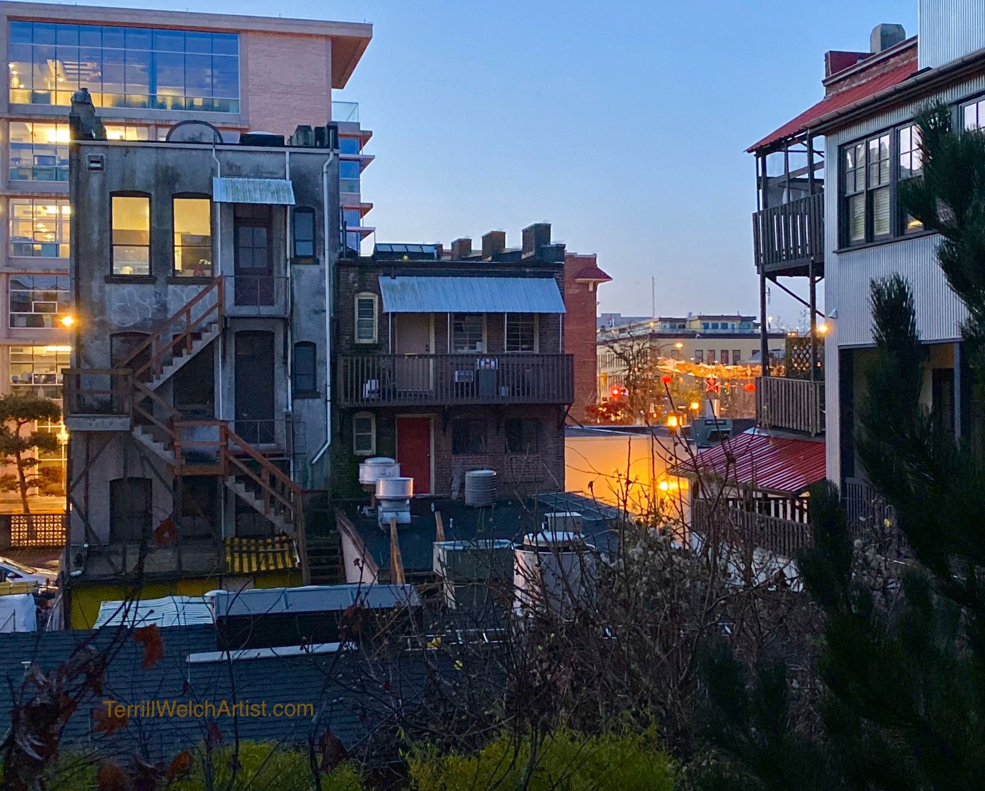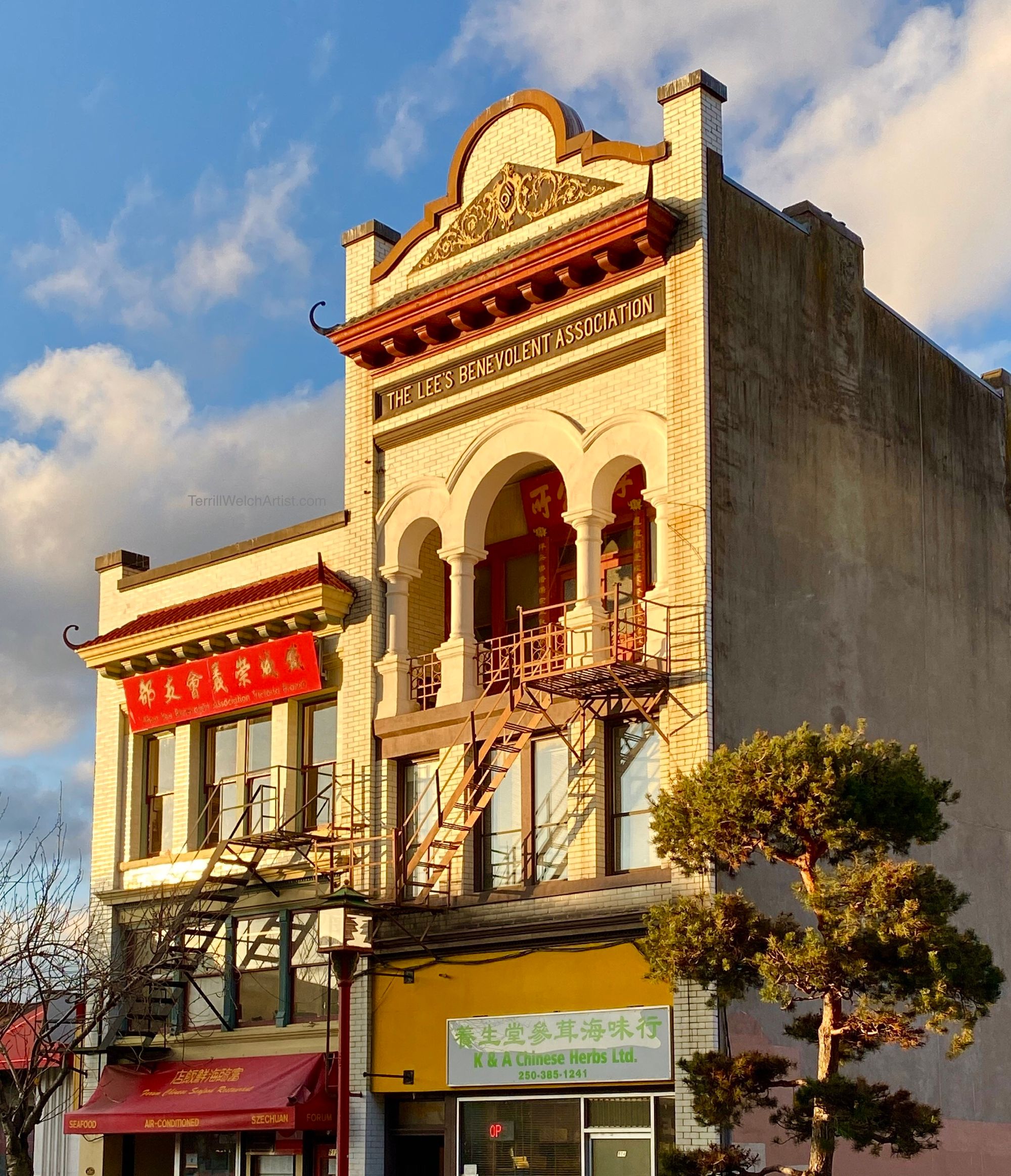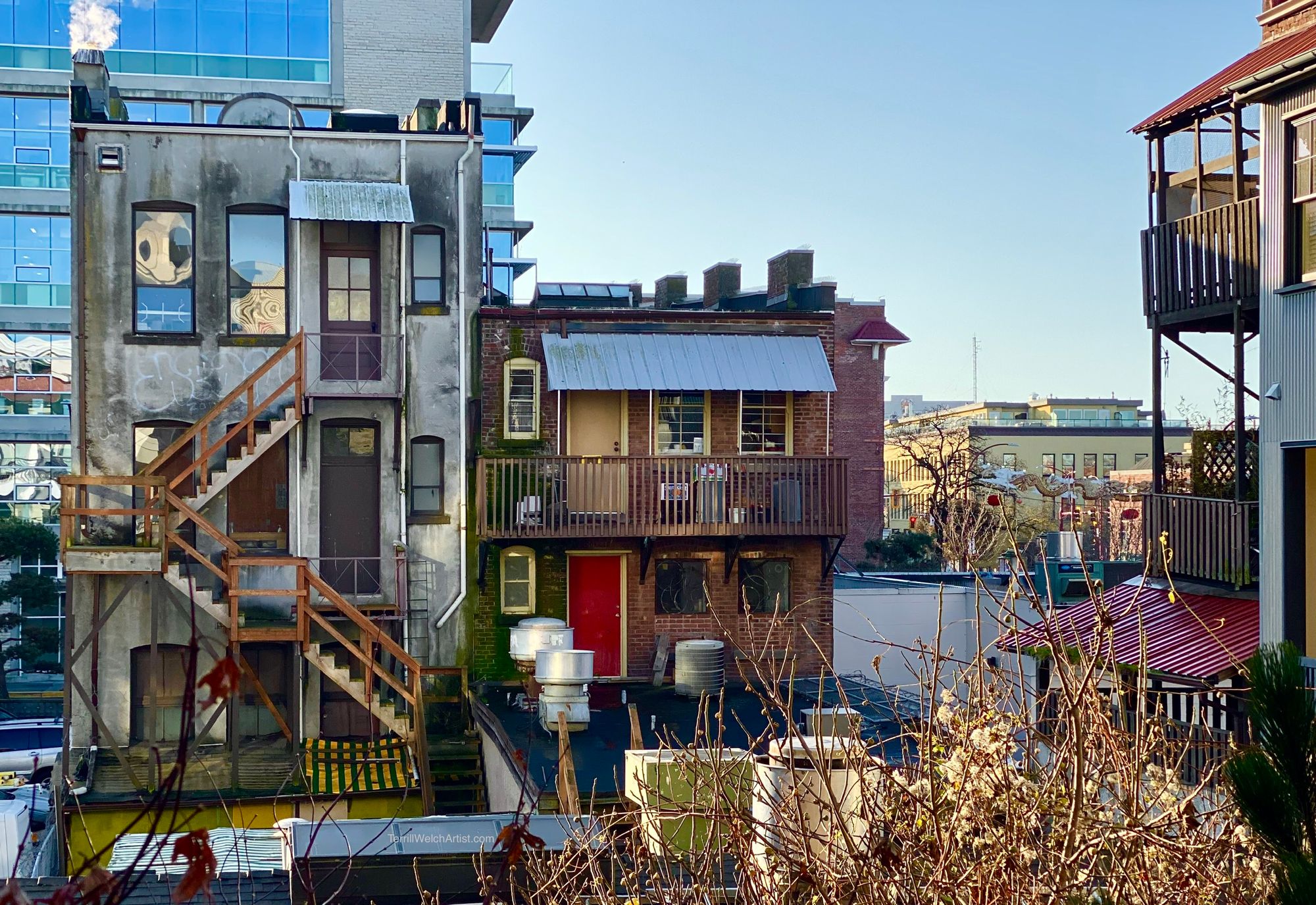 We have been in Victoria B.C. this past week for appointments. However, I never miss an opportunity to study the world around me and became fascinated with the Lee’s Benevolent Association building and the one next to it. My first study images were fro the back of the building at just after 7:00 am from our rental suite.