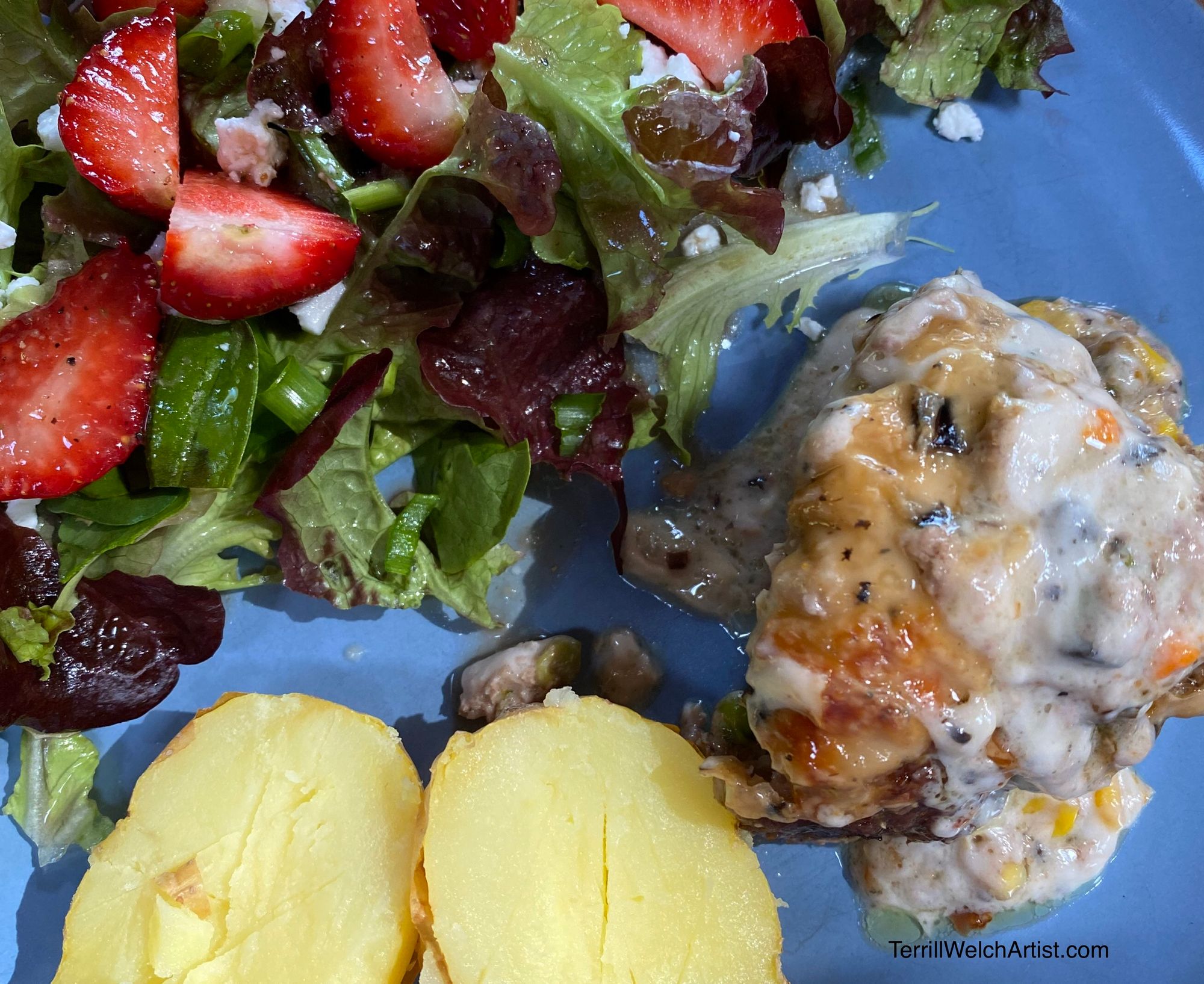 I was making meatloaf, baked potatoes and salad for an early supper. I had run out of tomatoes so strawberries it was!