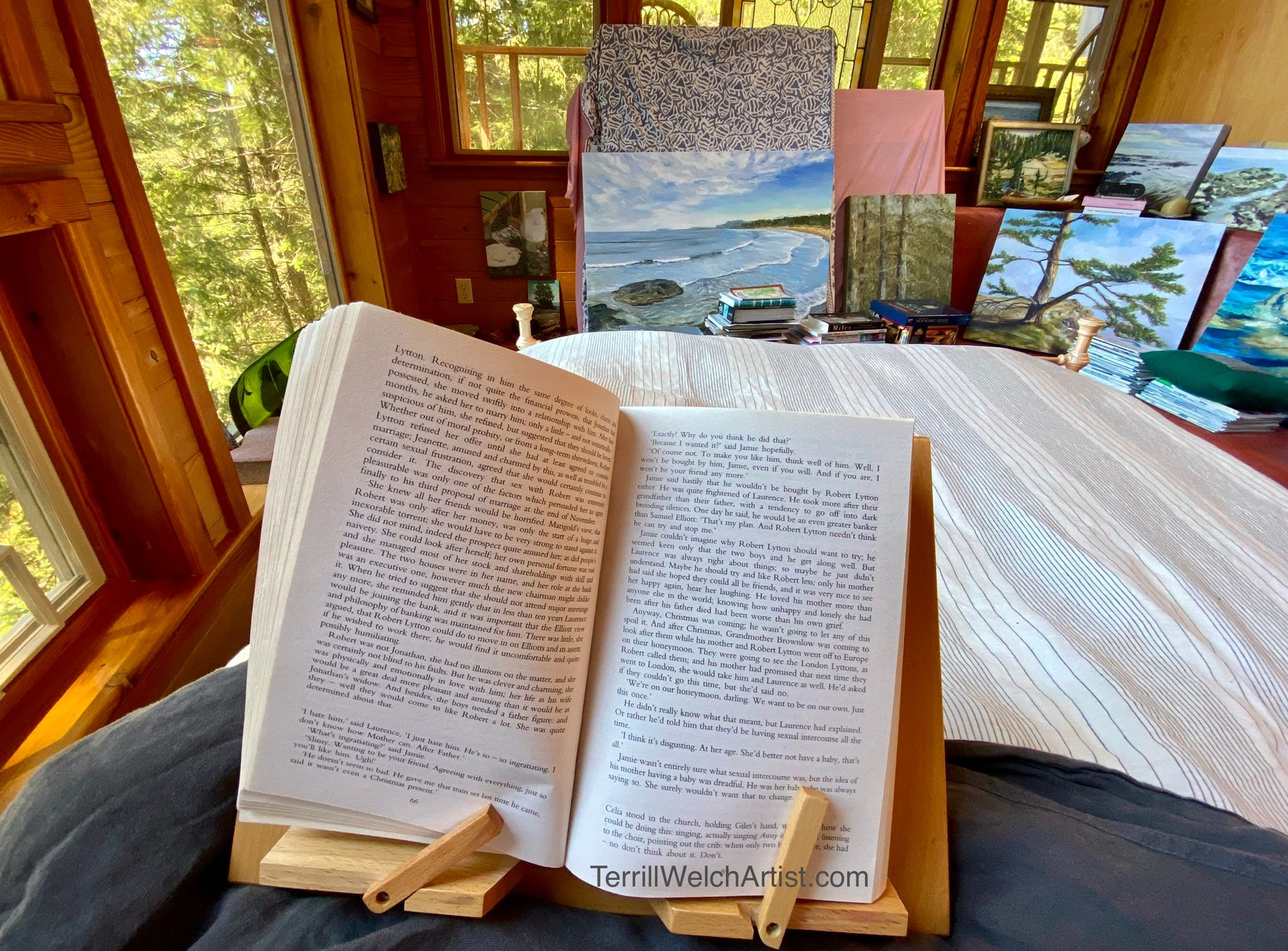 A couple of hours later, the phone rang and I discuss a painting inquiry with an art collector. Then it was leftovers for supper and rearranging from the deck to the bed before slipping back to my characters, who were deciding on biographies for their publishing house, going to socialist meetings, discussing the womenâs vote and other early 1900âs European kinds of things.