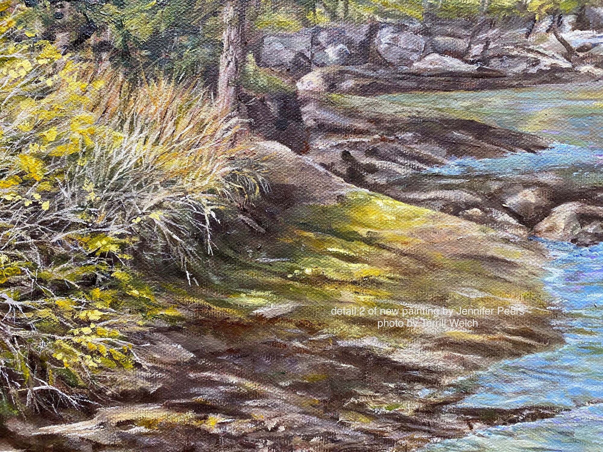 Jennifer - My vision of detail is deep and questioning. My answers come as I delve into layers of my chosen image. I begin adding paint to my canvas and capturing nature’s minute specs which then draw your eye closer into the painting. As an example, with a maple tree my eyes gently climb the aged wide trunk, laden with thick bark and moss. The branches protrude out and up, sometimes knarled, chasing the sun, and angling for a good position. I find the samaras (those flat double-winged fruit clusters hanging on the trees) are especially beautiful late summer as they dry and get ready to spin from the maples, blown down onto the grass, or as they are hanging in big clumps just below the vibrant green leaves. These little details are what I love to capture. I love my plein air sessions to relax and let my brush strokes flow! Don’t get me started on the greens in nature!