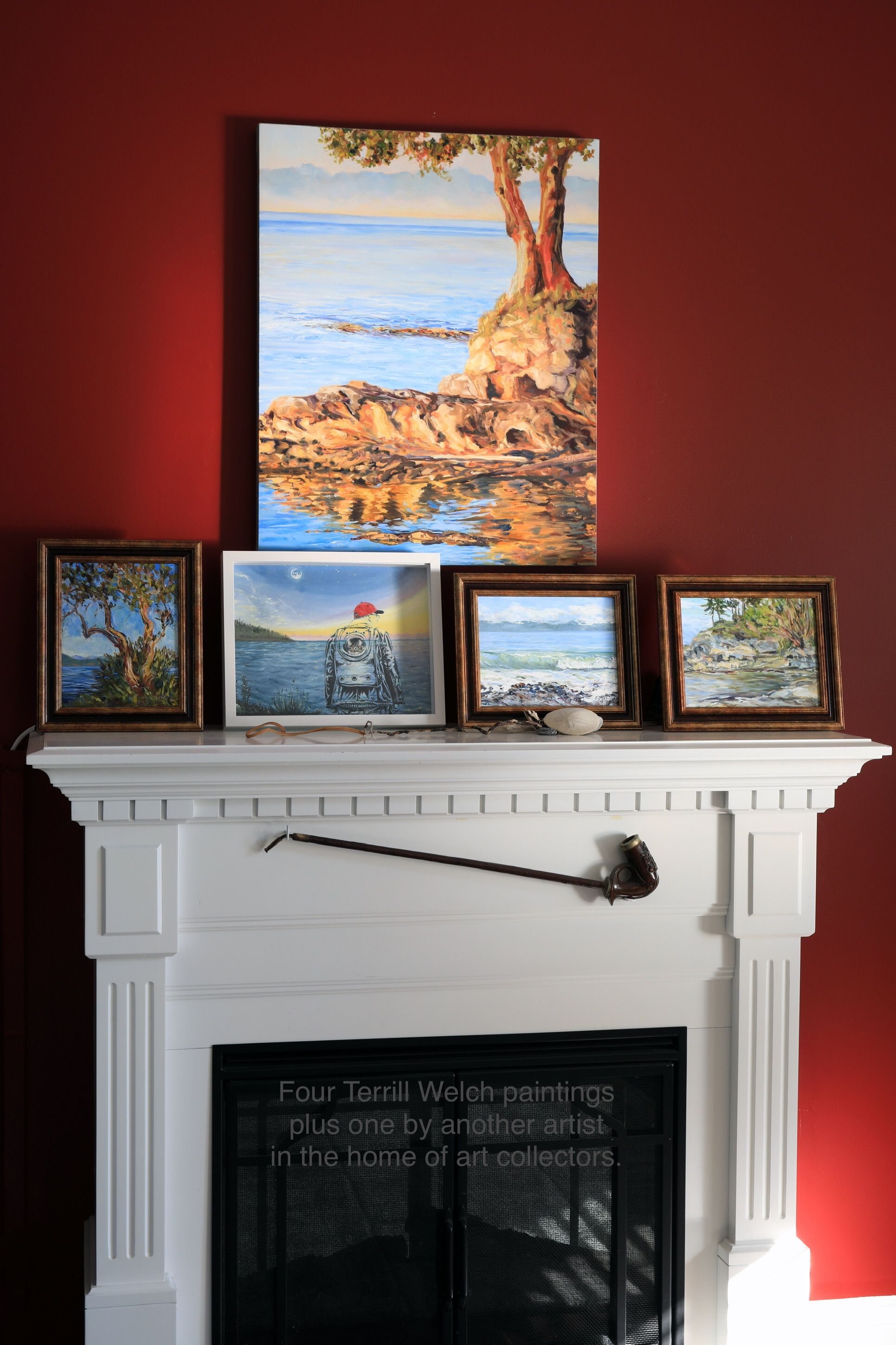 These art collectors purchased several of my paintings this spring, right at the beginning of our pandemic, and then a couple more painting sketches a few months later. They have now placed lovely frames on the small painting sketches and, for now, are showing four of their five “Terrill Welch paintings” together with a special oil painting by an artist cousin that is in the white frame. I always enjoy seeing work in its home environment. So I asked permission to share this image with you. I hope you enjoy it as much as I have.