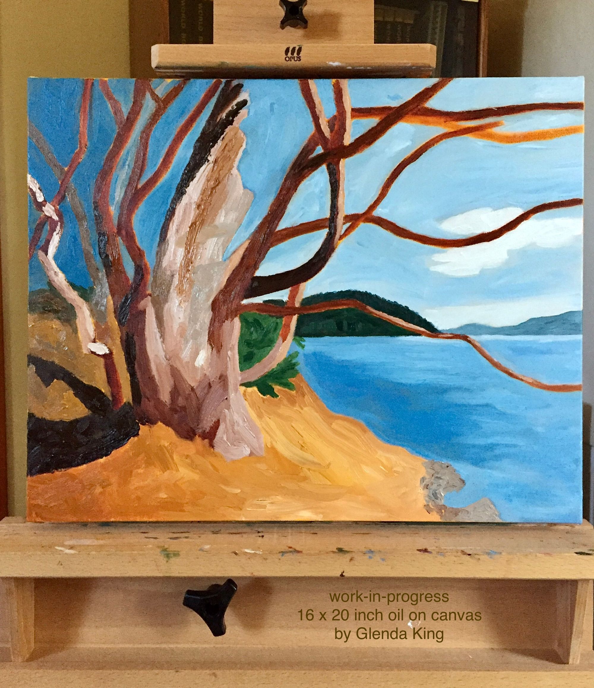 The first work-in-progress is by Glenda King. Her usual strong rich colours are already evident on this 16 x 20 inch oil on canvas.