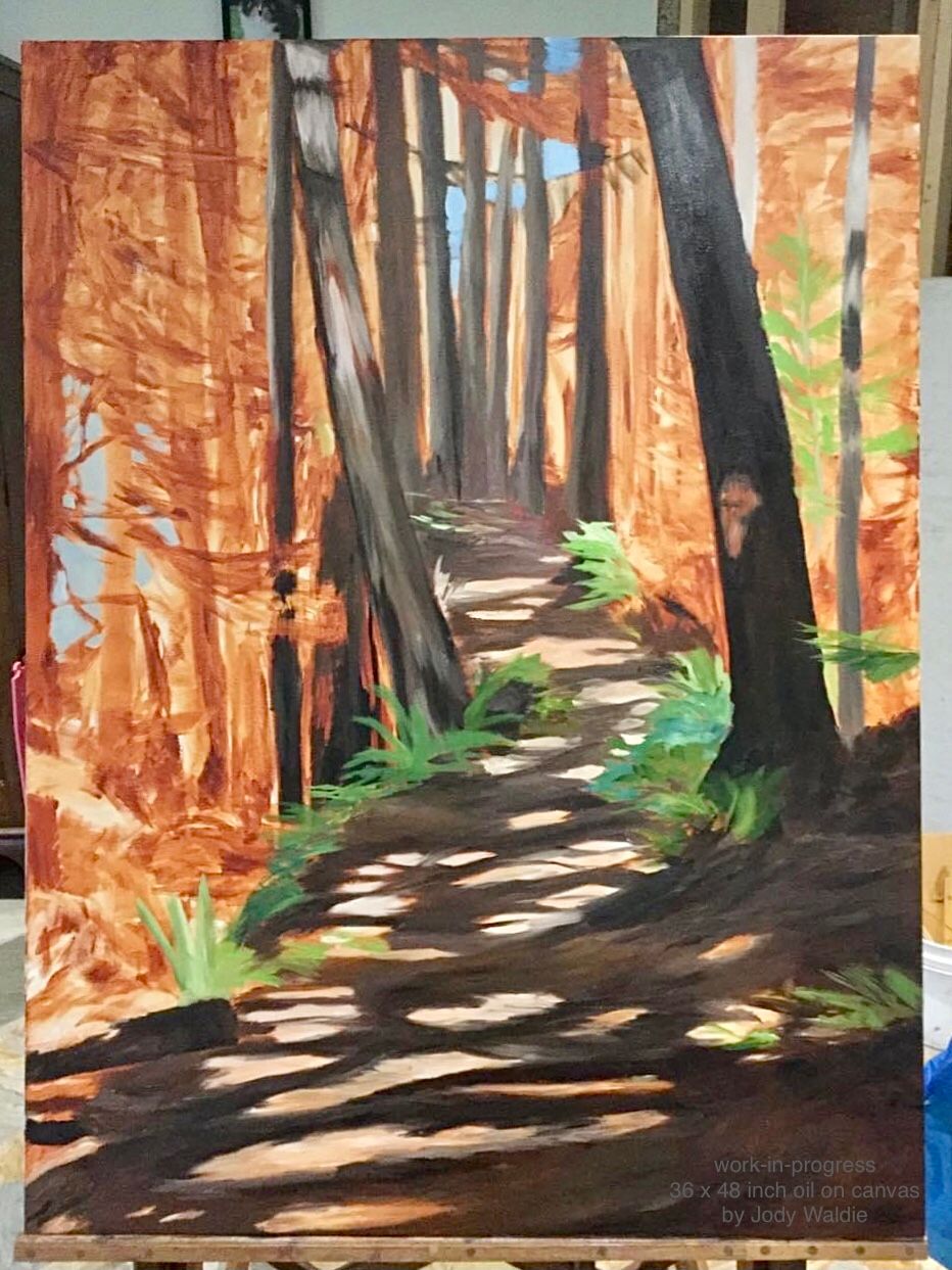 This second work-in-progress is by Jody Waldie and it is a large 48 x 36 inch canvas. Jody’s incredible underpainting is still visible as she begins to block in the this trail through the woods scene.