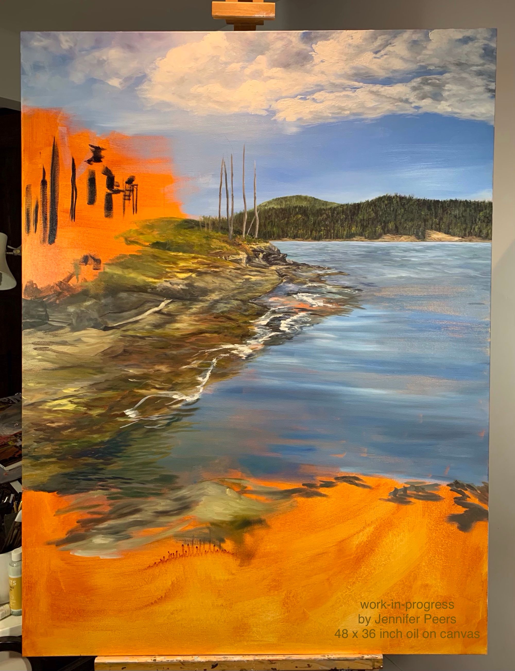 The third and final work in progress is by Jennifer Peers on another large 48 x 36 inch canvas and features one of her favourite subjects - Active Pass.