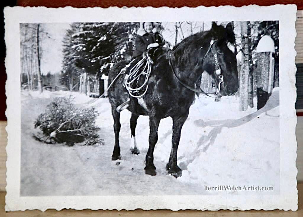 There was no car on this rural farm at this time. All travel, when travel was necessary, was done on foot, horseback or horse and wagon. On this particular December day, a little girl, by herself, went to get the Christmas Tree with her favourite horse. She is likely about five years old I think, though it is hard to tell in photograph, and it has been a long time since I have been told this story. When I looked at this photograph as a child myself, I didn't wonder how this small girl, who is my mother Nell, got up and down off the horse because I knew.