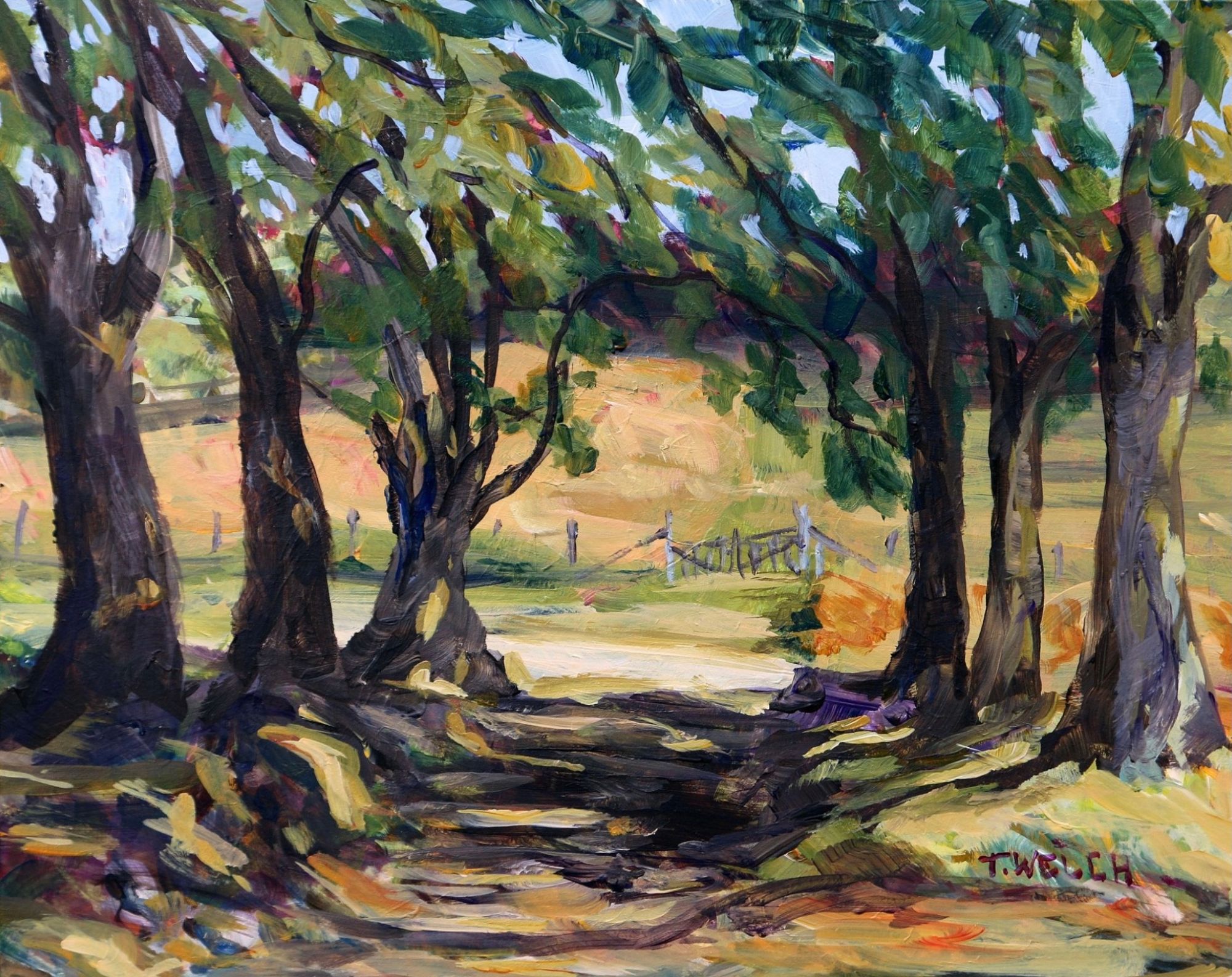 Available for sale from Terrill Welch Gallery, Terrill Welch, Maple Tree Edged Summer Morning (2020), Acrylic on gessobord, 8 × 10 in