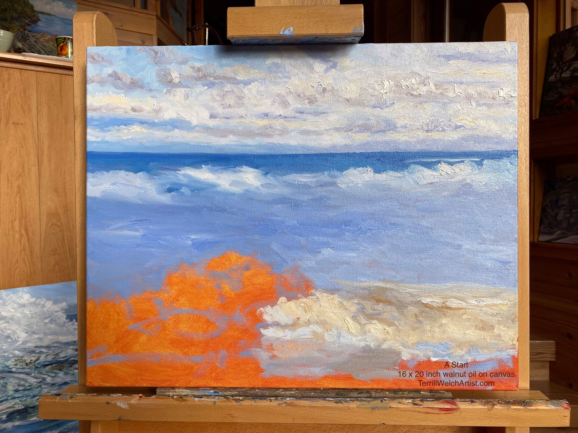 The start of the painting stayed on the easel for a couple of more days like a warm, comforting, smooth worry-stone in this painter’s pocket. Then one morning she woke and squeezed fresh colours onto the palette. It was time.