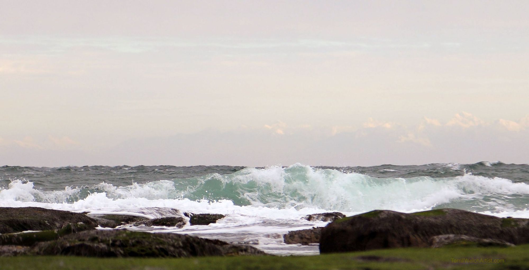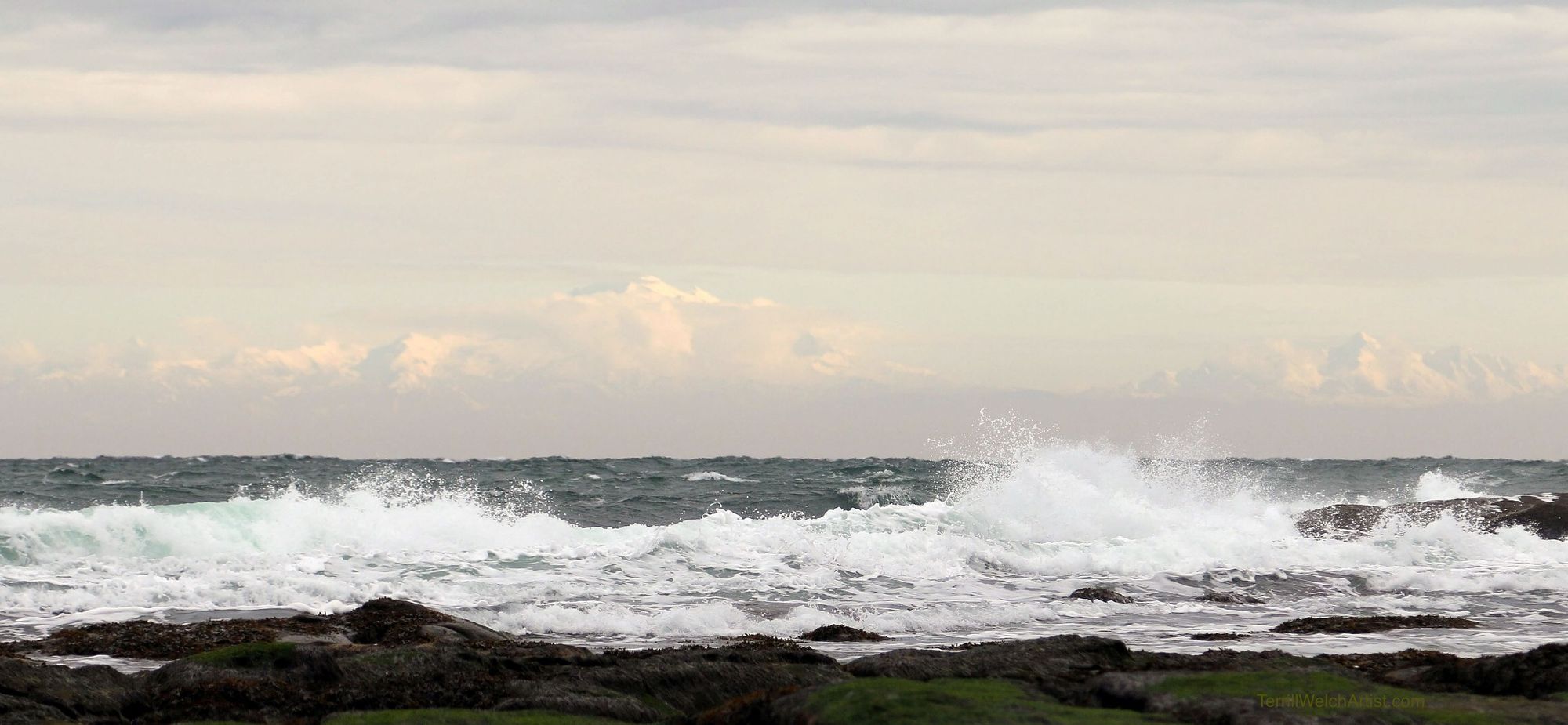 A little less than a foot of snow blanked the southwest coast and our small island this past few days. Early blooming spring flowers withered as temperatures dropped below freezing. Still, the art shows must go on and we take you between the waves of past and present in this issue, beginning with a new work by Terrill Welch.