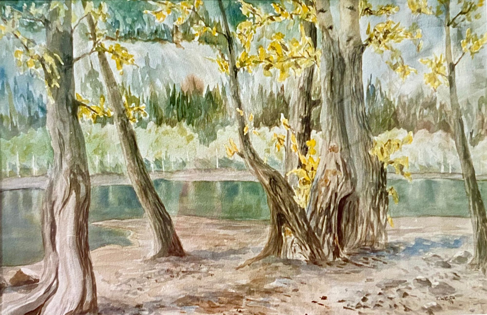 I spent yesterday going through boxes of old photos and found some of my earlier water colour paintings. At time I wasn’t working very often in oils because my homes were small and the fumes too much without a separate studio space which simple was not in the budget. This one is from 1994 and is on a quarter sheet of 300 lb Arches water colour paper. The view is from Honeymoon Island on Stuart Lake BC.