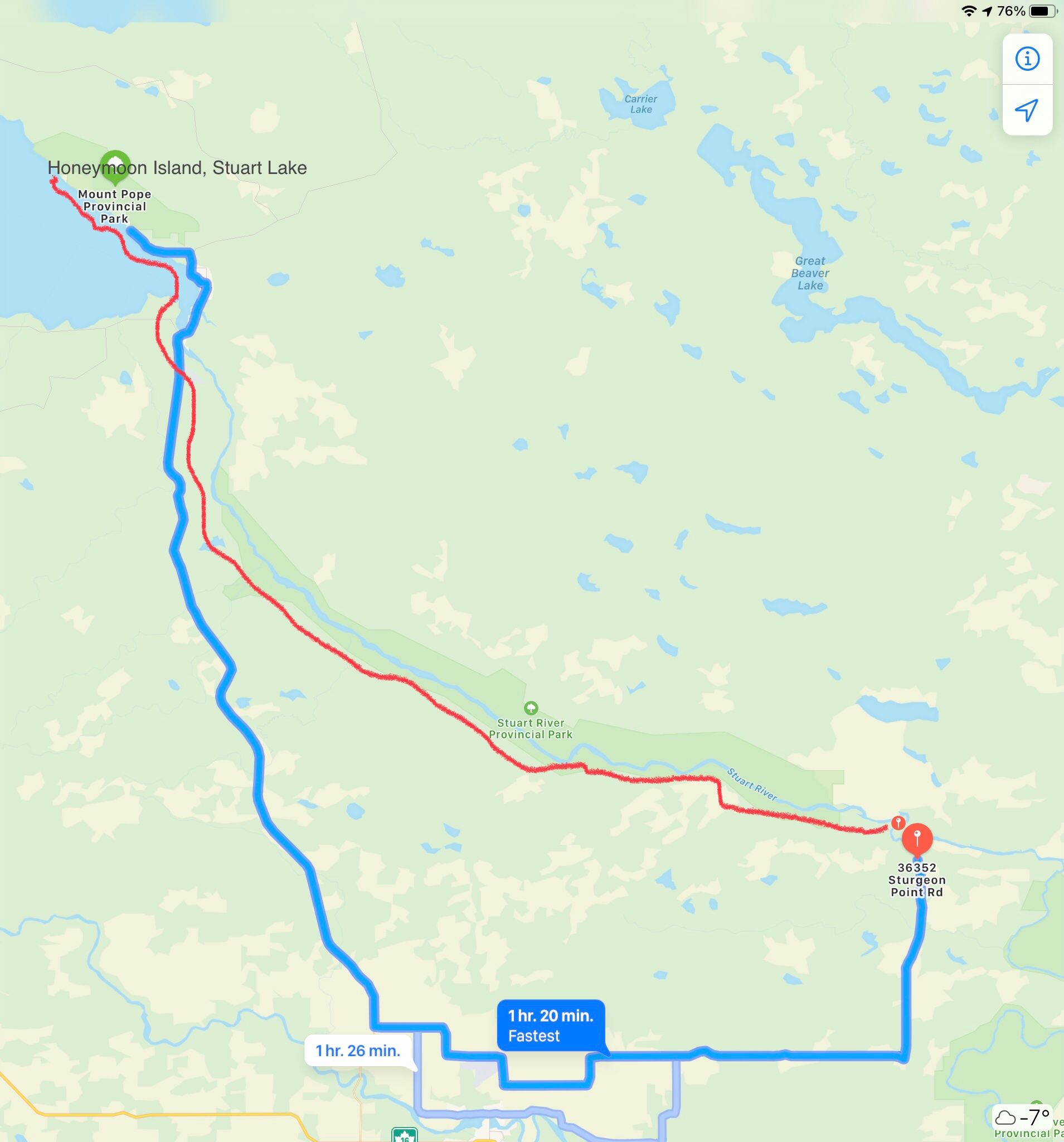 I am including a map so you have some idea where we were going. The red line runs along the Stuart River and up the Stuart Lake until it reaches Honeymoon Island. It took us most of the day if I remember correctly.