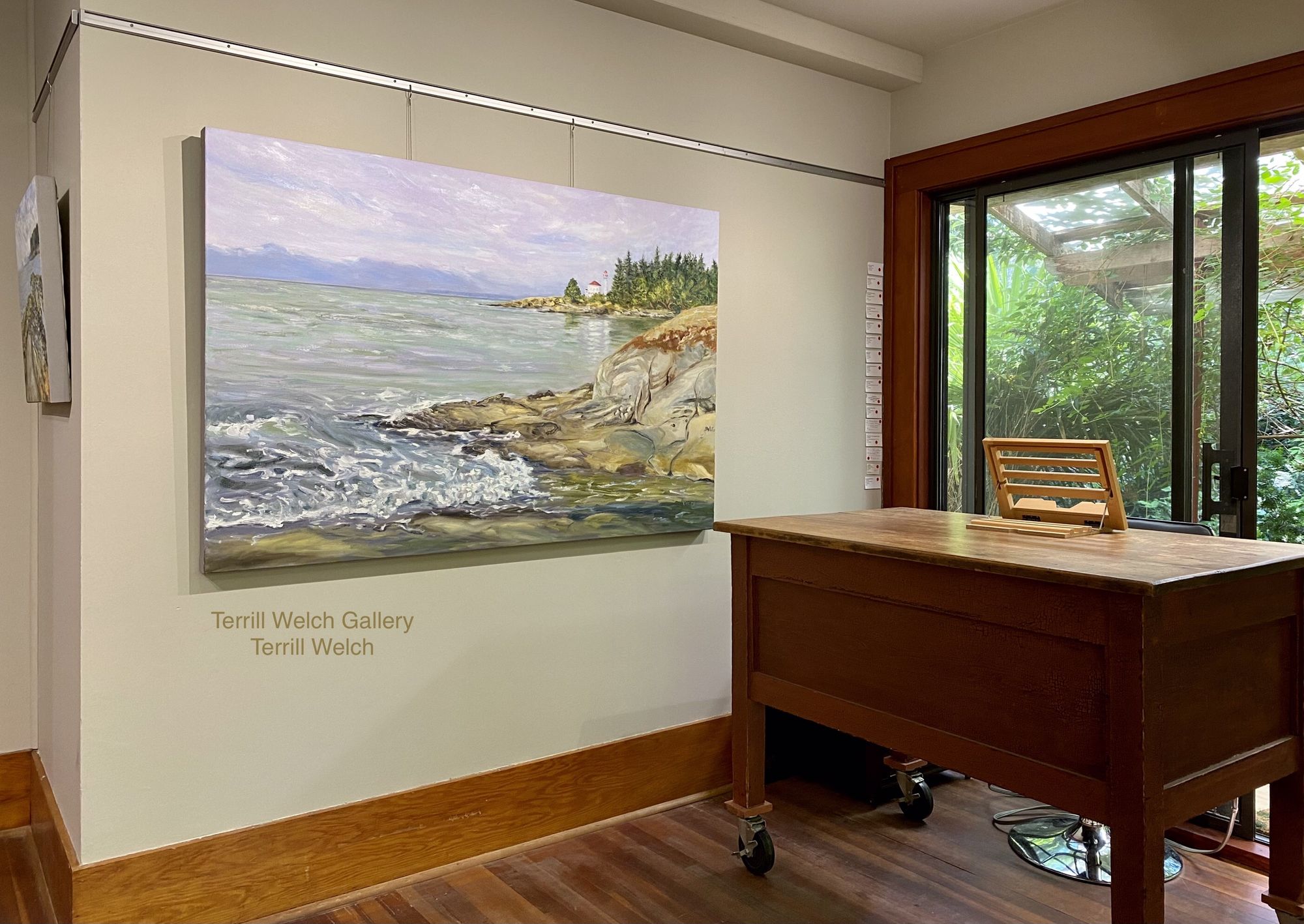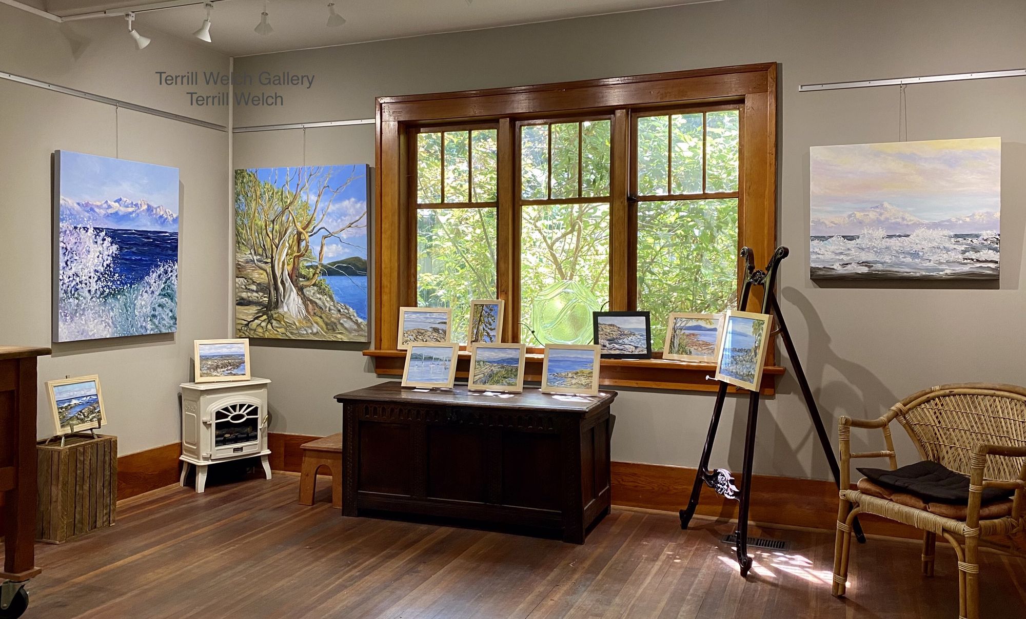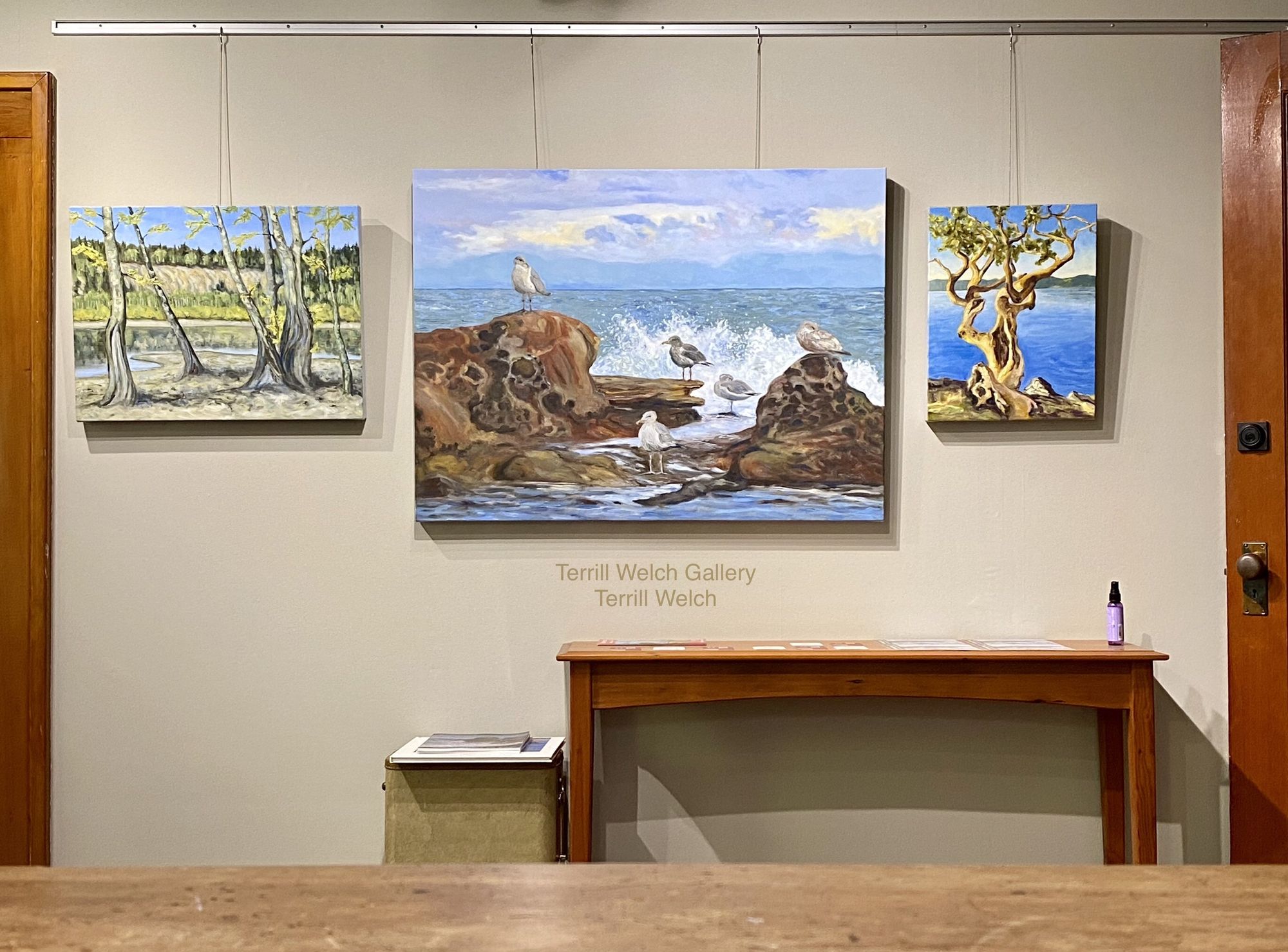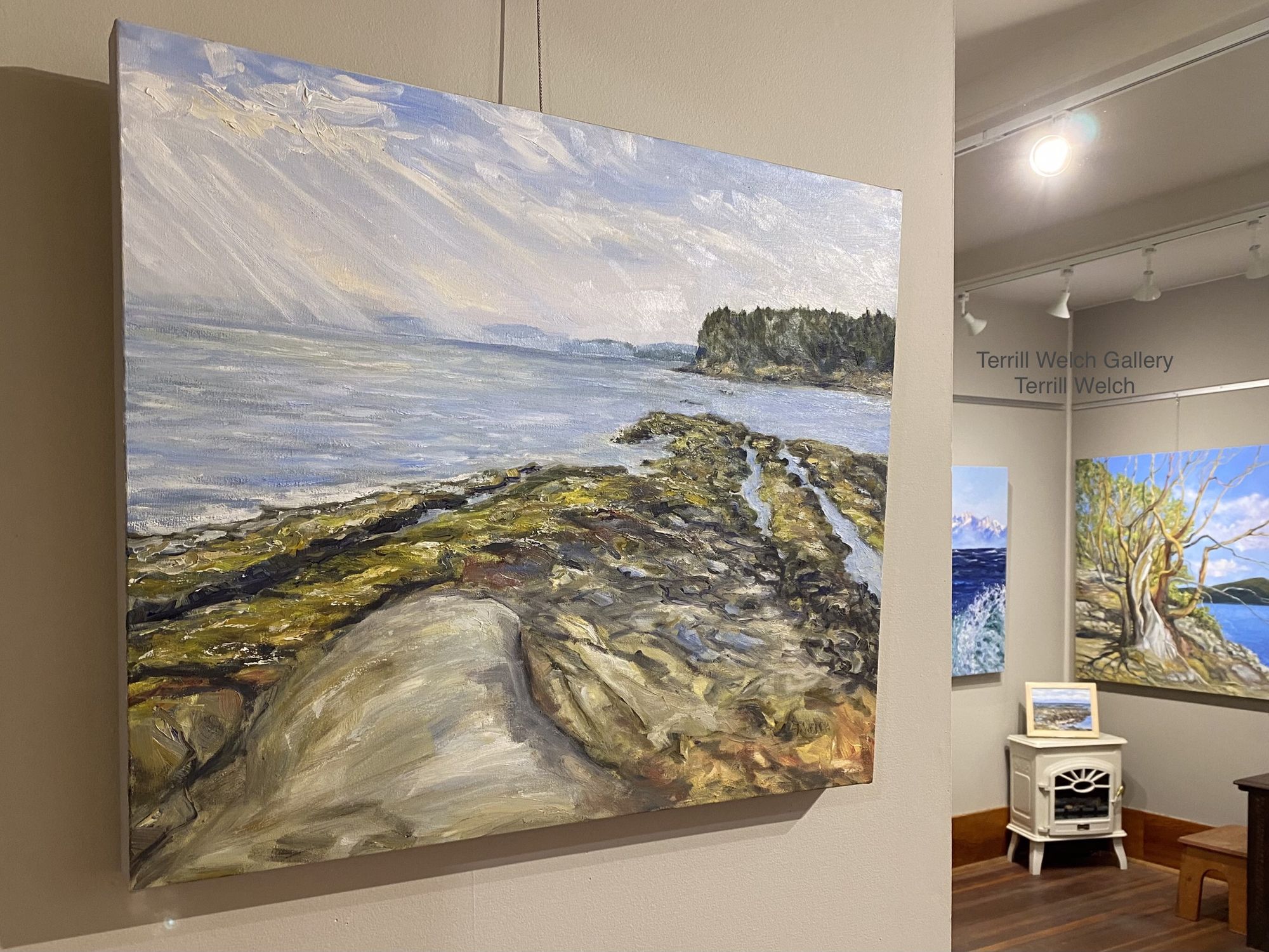 An essential rush of early dawn drapes over the curves of an Arbutus tree along the Mayne Island shore. Waves roll up and separate into cascading jewels. Seagulls rest in a moment of quiet communion. Dreams and memories meld into imagined and remembered places. This has been an unprecedented year for sure. But what does this mean for landscape painter Terrill Welch? As we linger with her recent works, we can sense the need to step lightly, to pause and softly brush a branch aside for a clearer view. Nature has spoken. All our thrashing and inward self-absorption can easily be set aside. We shall mature away from our financial means. We shall because this is what happens in the wholeness of life. Grief and hope lay in universal overlapping brushstrokes of trees and the sea and the shore.
