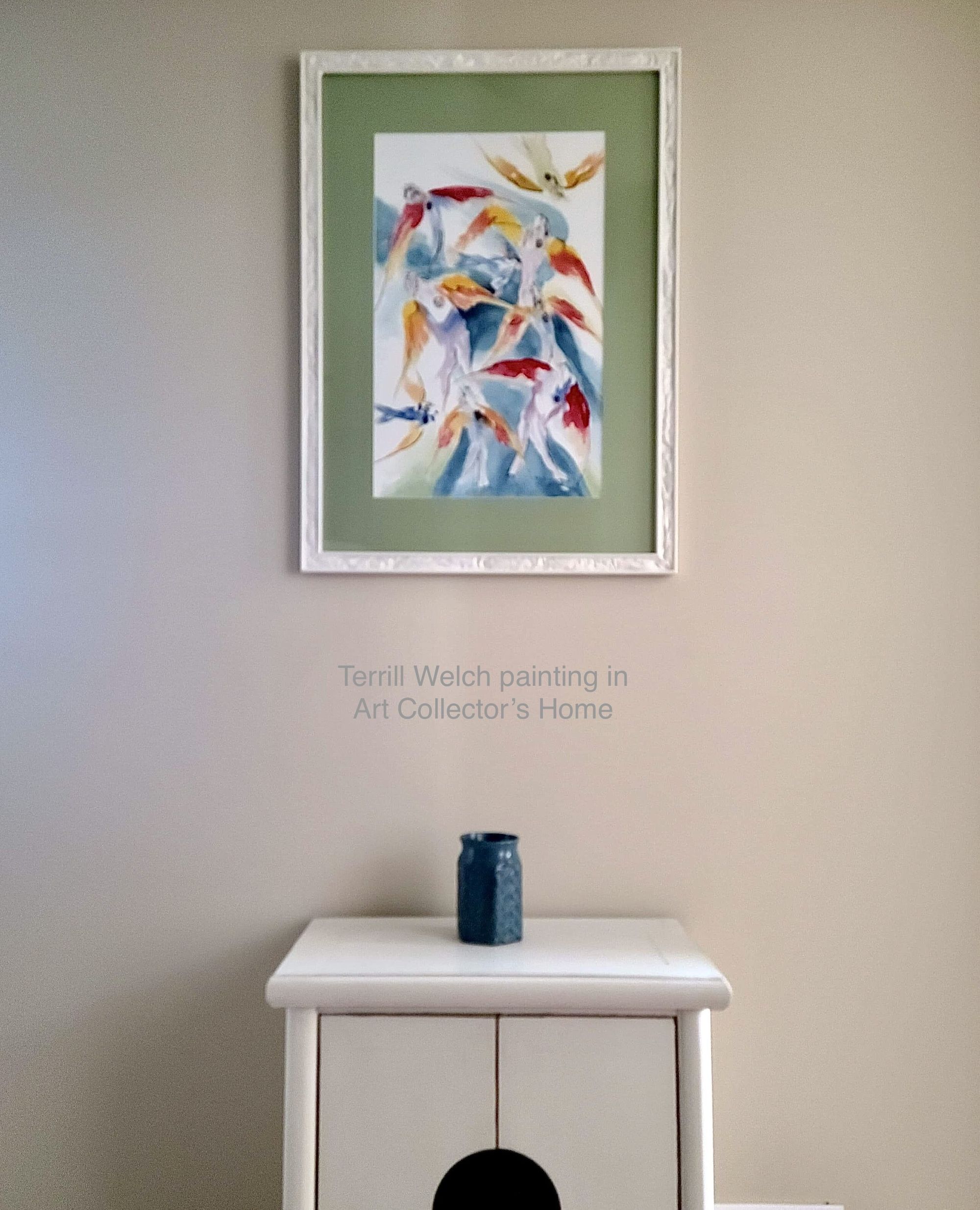 The art collector has recently retired and moved to a new city and home. It is not the first adventure of several hundred miles this painting has had with her but I get the sense that there is a desire for this to be their home now for a very long time. To this end, the painting has a refurbished frame and has been cleaned and tucked back in. I am not sure of the paintings exact size but this room view will give you an idea of scale.