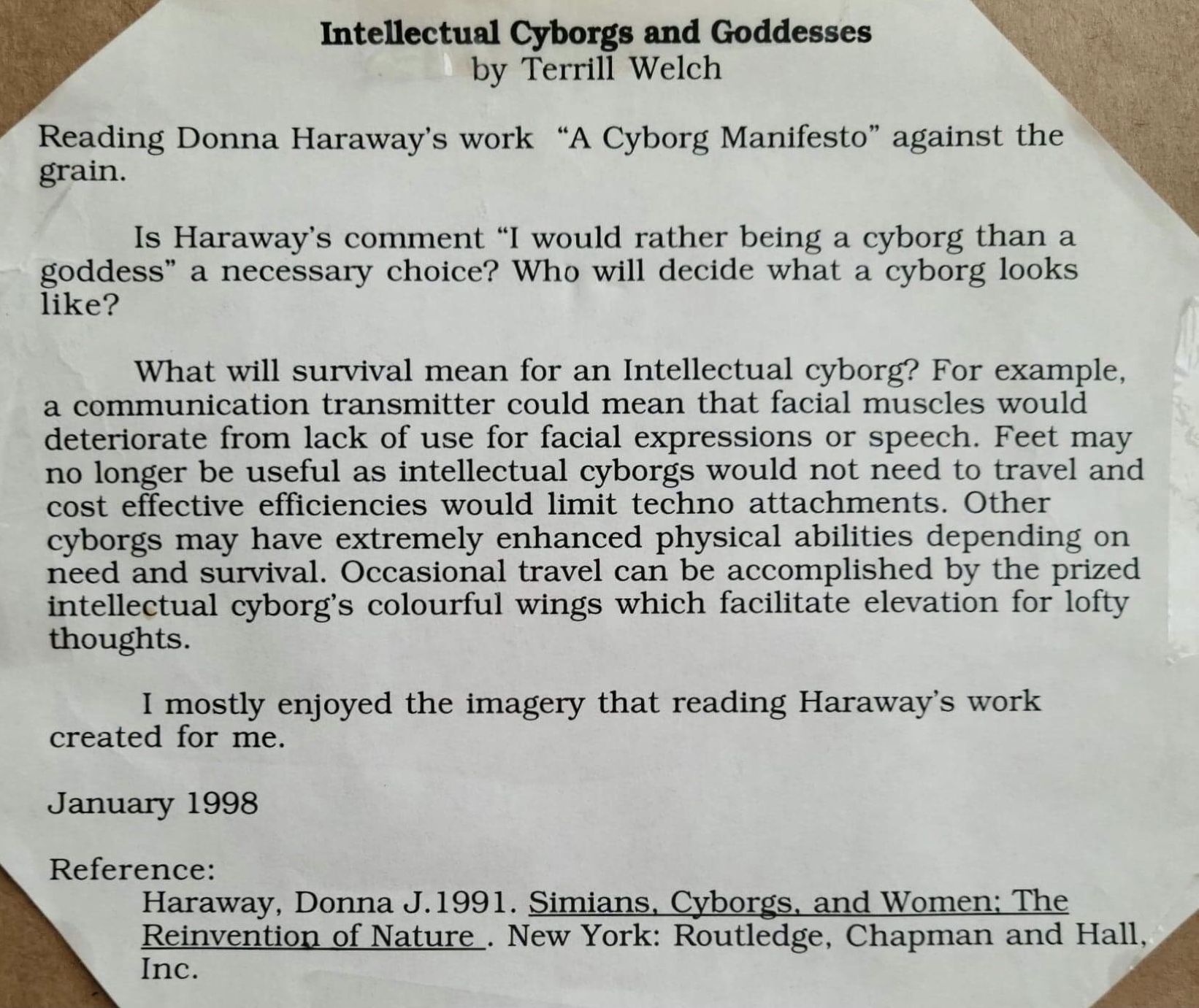 Fortunately, my artist notes were still attached to the back of the painting which is how I did things before I had an online inventory program like I do now. When I received the image of the painting, I went to the bookshelf and pulled out Haraway’s book, as if remembering an old friend from over 20 years ago. But this is better because it was what I was actually thinking about at the time…