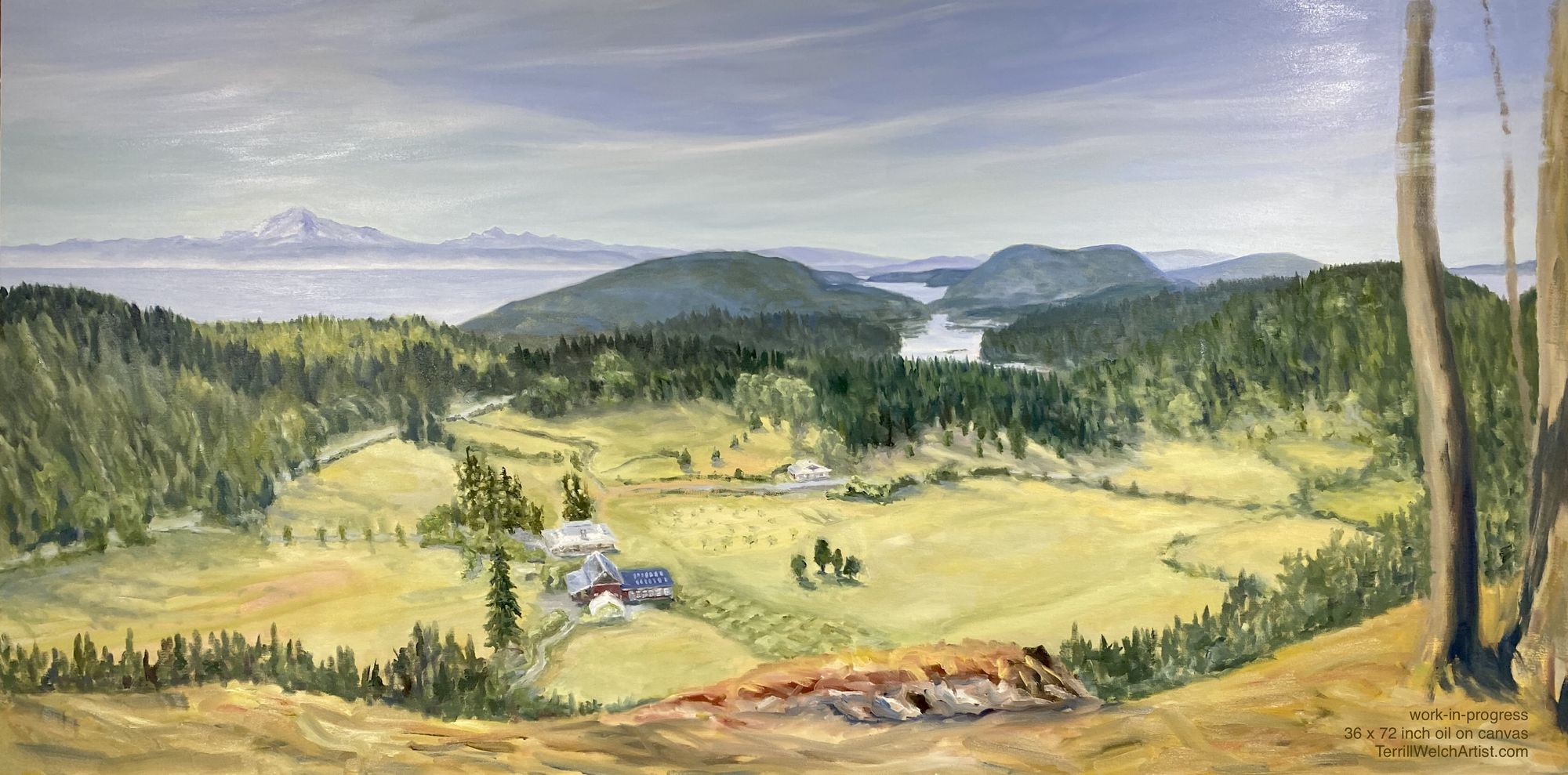 Mount Baker, as you can likely guess, is one of my major reference points as I am composing and painting this rather complex grand view. So no moving mountains! Just a few trees and the cliff line slightly. 😉