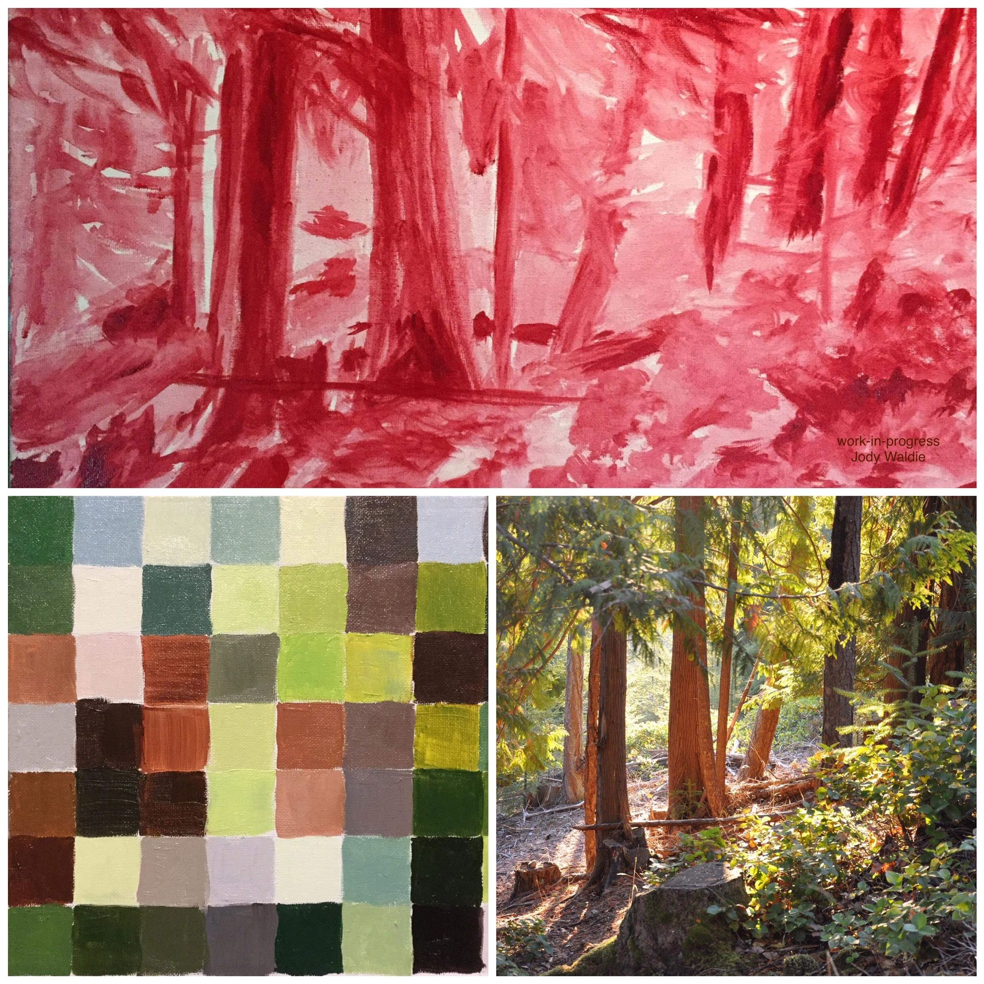Let’s look at another work and see how it developed. In this case, Jody did red underpainting plus a colour study from her reference so that she could distinguish and render the various shades of green in the foliage as the sun was streaming through.