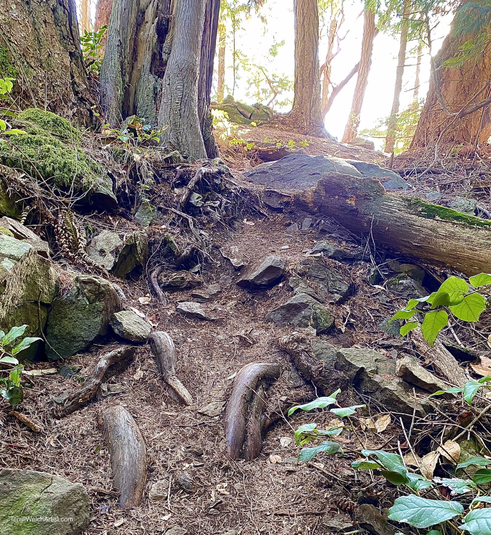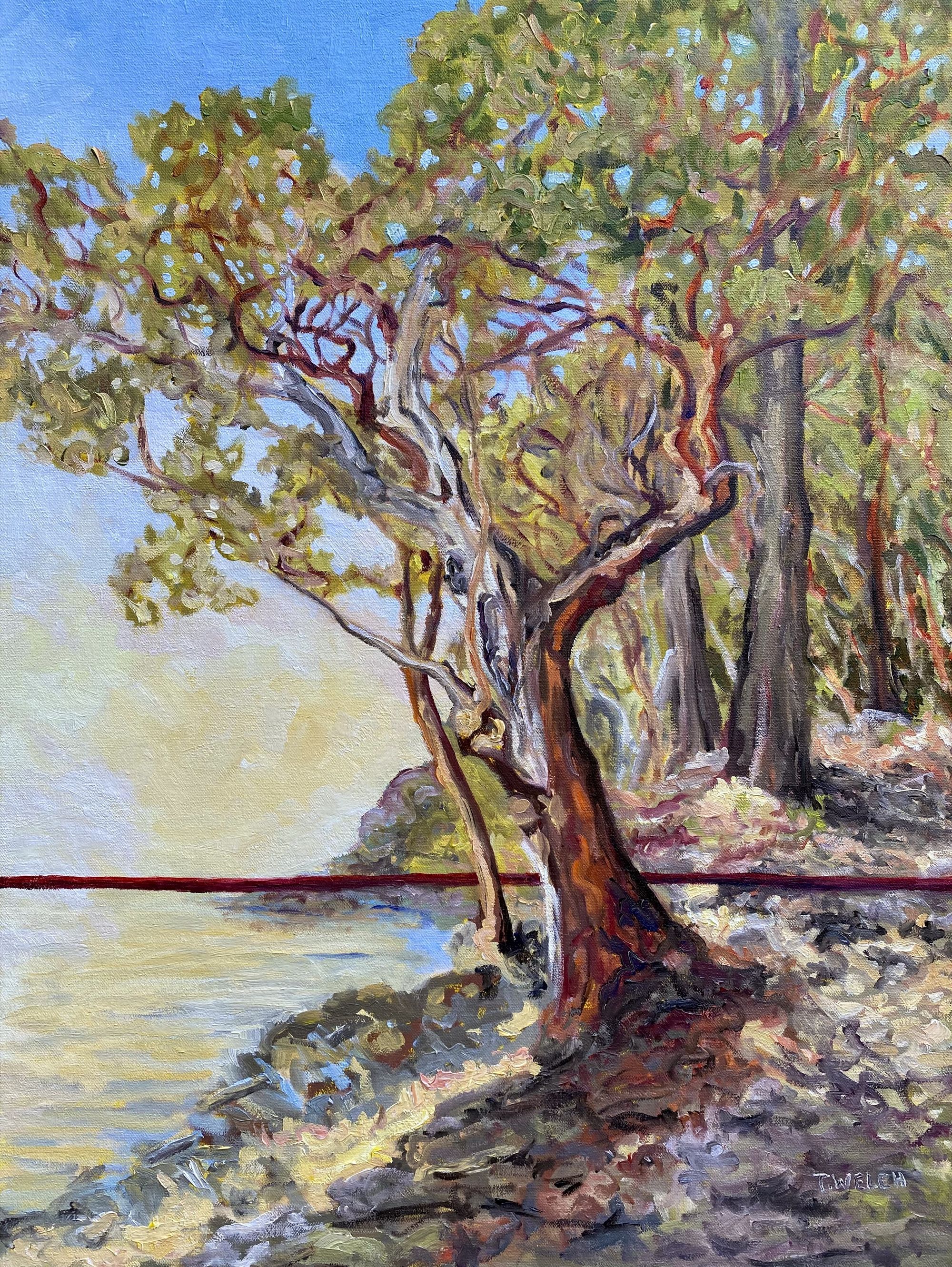 Artist Notes: These Arbutus trees are in trouble. There is a good chance they won’t survive, at least in this location, over the next twenty years. I am baring witness, keeping a record, standing with them in their suffering. The path has widened over another dry summer from thousands of tromping hiking shoes. I wonder if these fellow walkers see what I see. Dried grasses are carried away on a hot breeze, revealing shards of naked stones. For the fourth year in a row, the drought has been long, too long. Stressed, the trees will be susceptible to various kinds of native fungus that turn their leaves black and branches are forces to die back. Sometimes whole trunks become standing grey skeletons. These are simple observations that leave a red line reminder in an otherwise blissful landscape. I have chosen to add that red line.