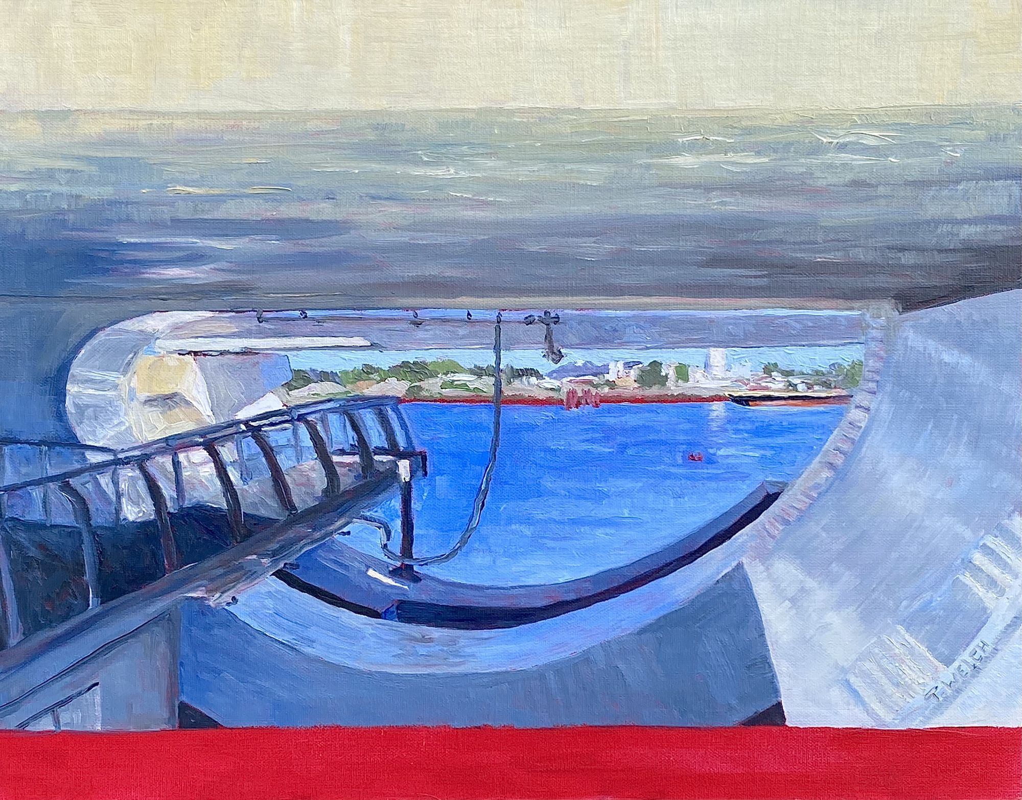 This second work is a little different subject matter for me and I enjoyed the challenge. It took me half a day and I already had the rough sketch on the linen board. For an 11 x 14 inch linen board, this is a long time, much longer than I would usually take. It is a unique work for me because of the heavy emphasis on complex non-organic structures. I took the reference this past summer from under the new Johnson Street Bridge and thought - I wonder if I will ever dare to paint it!? All those intersecting lines and curves framing the industrial shore along the Gorge waterway! It is aggressive somehow with a masculine strength. Still, there is something compelling about the view and it is a perfect fit for an addition to my Red Line series. This was the day that the oil paint hit the linen board in a new way! And yes the red band is likely to stay at the bottom of the painting. It just feels right to me.
